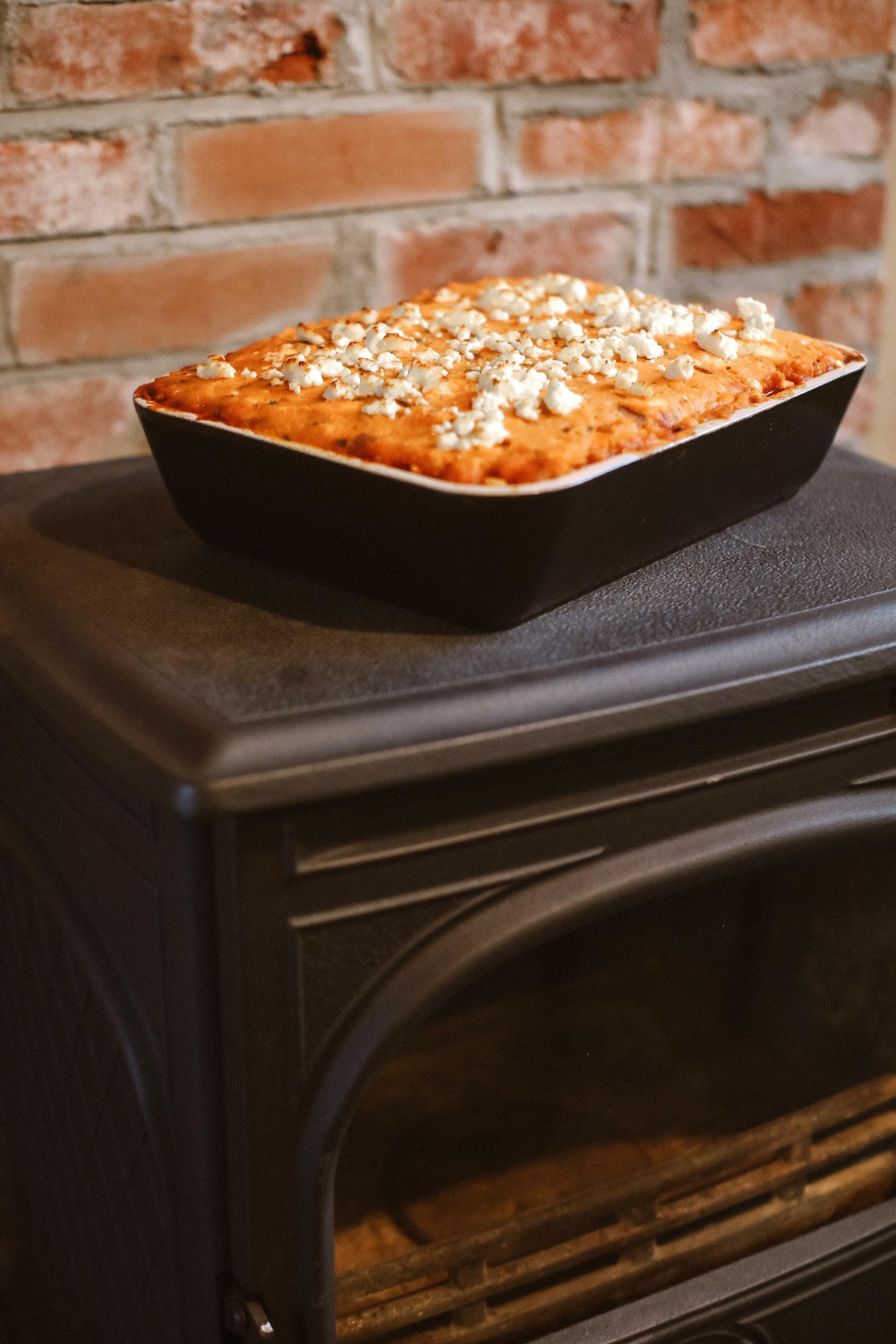 Doe de vlees/groente saus in een ingevette ovenschaal en smeer daaroverheen de aardappelpuree met als topping de laatste feta. Je Shepherd's pie met kip kan nu ca. 30 min. de oven in. Optioneel kun je na 20 min. oventijd de feta toevoegen zodat deze warm is maar wel een mooie structuur behoudt.