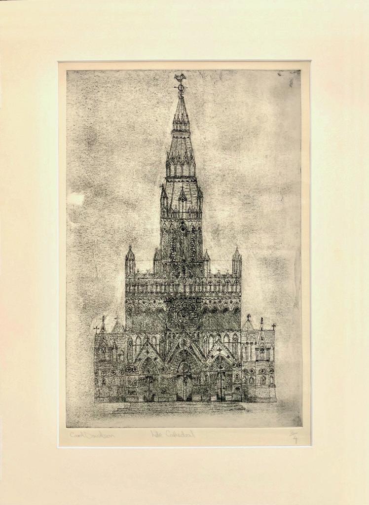 Carol says, “I did two years at Gray’s School of Art and two years at Duncan of Jordanstone College of Art in Dundee, where I graduated with an Honours degree in Art and Design (Woven Textiles). I went on holiday when I was a student to France - to Paris, Brittany, and Normandy, then to Lille. I like visiting churches and did some drawing there. I did the etching of Lille Cathedral at Peacock Printmakers in the Castlegate. It was the first etching I did. As well as textiles I did paintings, prints and painted furniture.