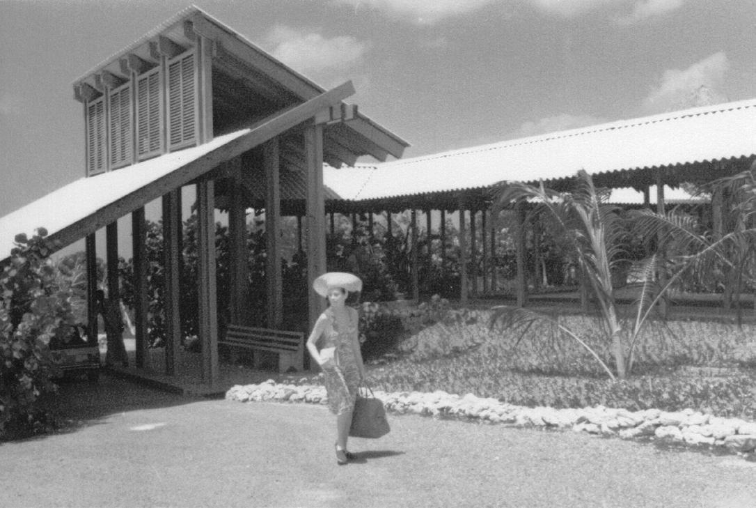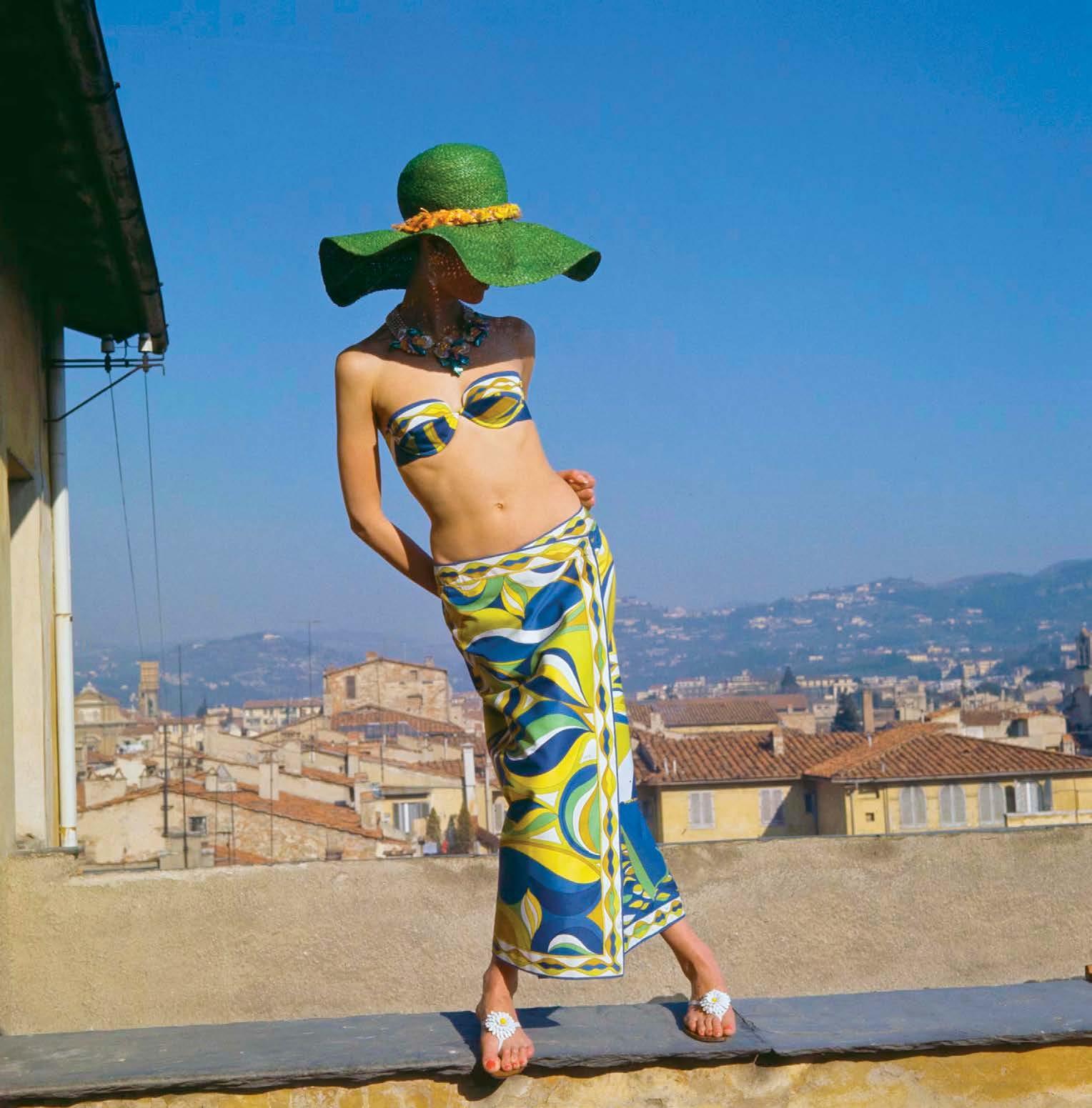 Pucci Spring/Summer 1965 A model in Florence, Italy sports a matching bikini and zulu-style skirt with an oversized green straw hat designed by Emilio Pucci for his 1965 Spring/Summer collection.