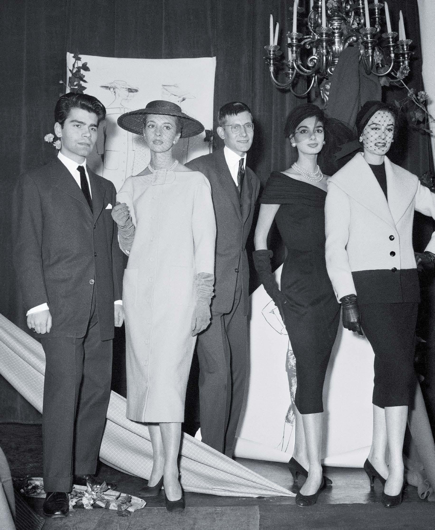 This page: 1. Véronique and Gregory Peck attend an event in Hollywood, January 1967. 2. A party of skiers adjourns for drinks on a Squaw Valley mountaintop in California, photographed by Slim Aarons, 1961. 3. A man on skis jumping over a pick-up truck in the 1940s; 4. Paul Belmondo and Princess Stephanie of Monaco seated on a chairlift in 1980. 5. Ann Bonfoey Taylor looking stylish on the slopes of Vail, Colorado, photographed by Toni Frissell, 1964. > Opposite page: 1. Jenny Guinness, aka model Windsor Elliott, walking on Park Avenue wearing a coat by Casa Cuero and flared trousers, photographed by Jack Robinson, 1968. 2. Aerin Lauder seated in the snow in Aspen, Colorado, photographed by Simon Upton; 3. Film comedian Mickey Rooney greets first lady Eleanor Roosevelt at her husband’s inaugural gala, 1941. 4. A model lying on an inflatable cushion wearing a yellow quilted jacket and pants by Michele Rosier for V de V on the Glacer de la Rosablanche in Switzerland, 1968, photographed by Arnaud de Rosnay. 5. The Silver Soap Studs photographed by Cecil Beaton, 1930.
