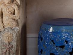 The designer’s instinctual understanding of complex serene colors combined with her passion for textiles, one-of-the-kind custom furniture, home décor, and curiosities found here and there during her extended travels and cooperations with artisans in Europe are her personal trademarks.