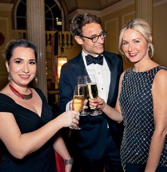 Clockwise from top left: Jonathan Sessions and Michael Reinert; Susan and Hunter Cushing; Brooke Kosinski; Farley Rentschler and Consul General Anthony Bailey OBE; violinest equipped with glasses of Champagne.
