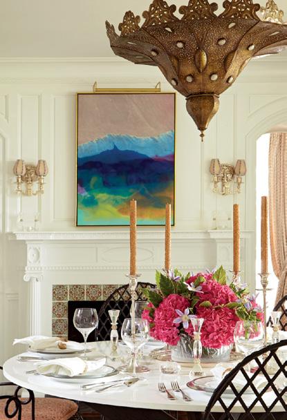 I love mixing metals, which is where this stunning Moroccan light fixture comes in. The perfect orange and gold tones were found in this Fortuny fabric for the seat cushions that tie everything together. I also love to accessorize any room with fresh flowers to bring out subtle doses of bright color. It really makes a room come alive.