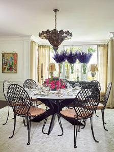 room. The iron chairs for example are dark bronze, but their lattice design also makes them feel airy. I chose a light table top so the space wasn’t too heavy. I do take into consideration the design pattern of the fine china when selecting fabrics and finishes. It all has to work together beautifully.