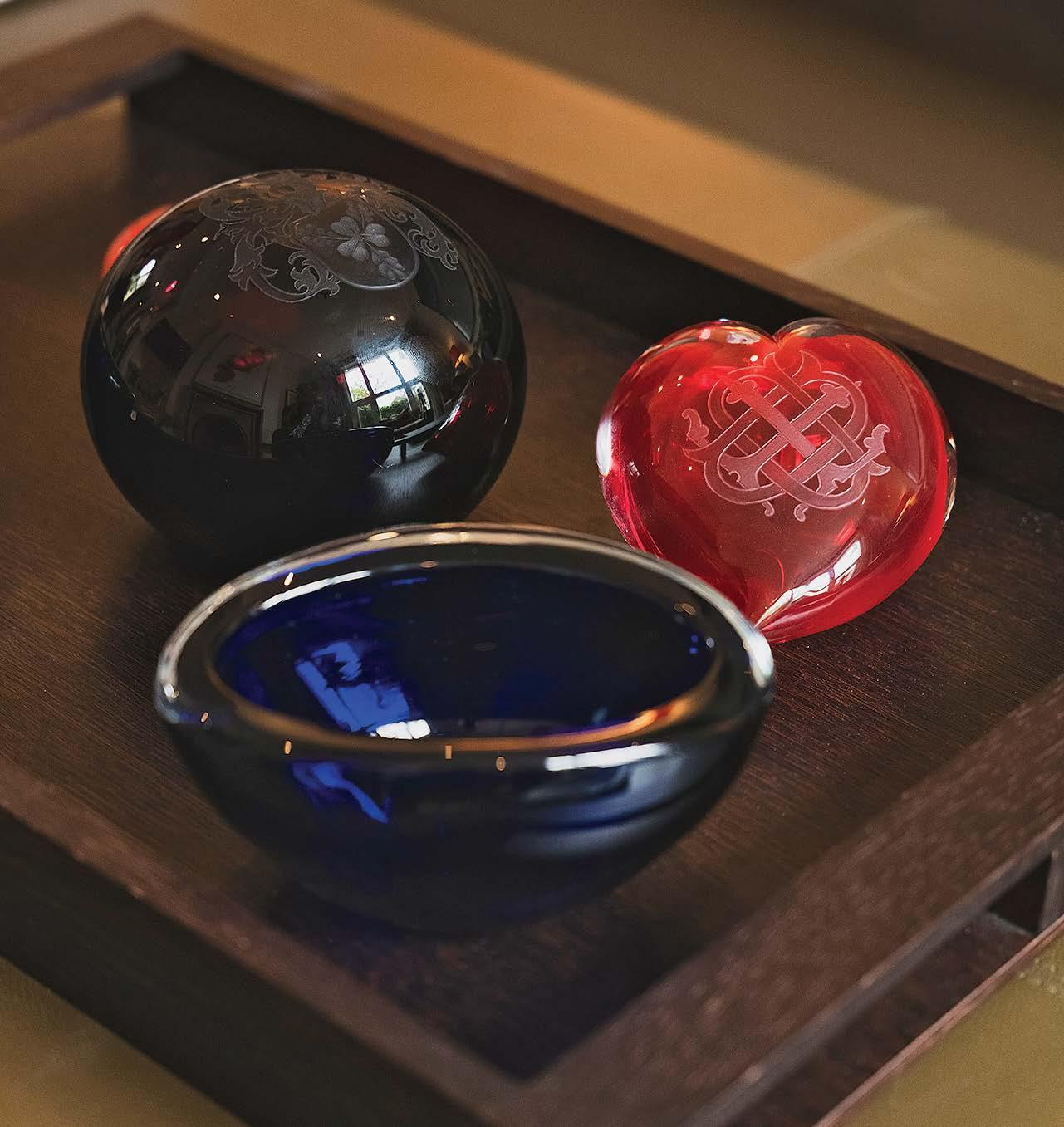 Debonnaire von Bismarck in the Vita Kin’s Shalimar Dress in Mango & Cream ($1,950). Opposite page, clockwise from top left: Debonnaire packaging; Giberto’s Blue Paperweight, $550 (left), BB Oggetti D’ Arte’s Blue Glass Bowl, $365 (front), and Giberto’s Red Glass Heart, $775 (right); von Bismarck in Vita Kin’s Shalimar Dress in Red & White ($1,950) with The City Farm Girl’s Rooster Foot Stool by her side (sizes and prices vary); Objet Luxe’s Monkey Madagascar Bowl ($510) and L’Objet’s Crocodile Letter Opener ($180).