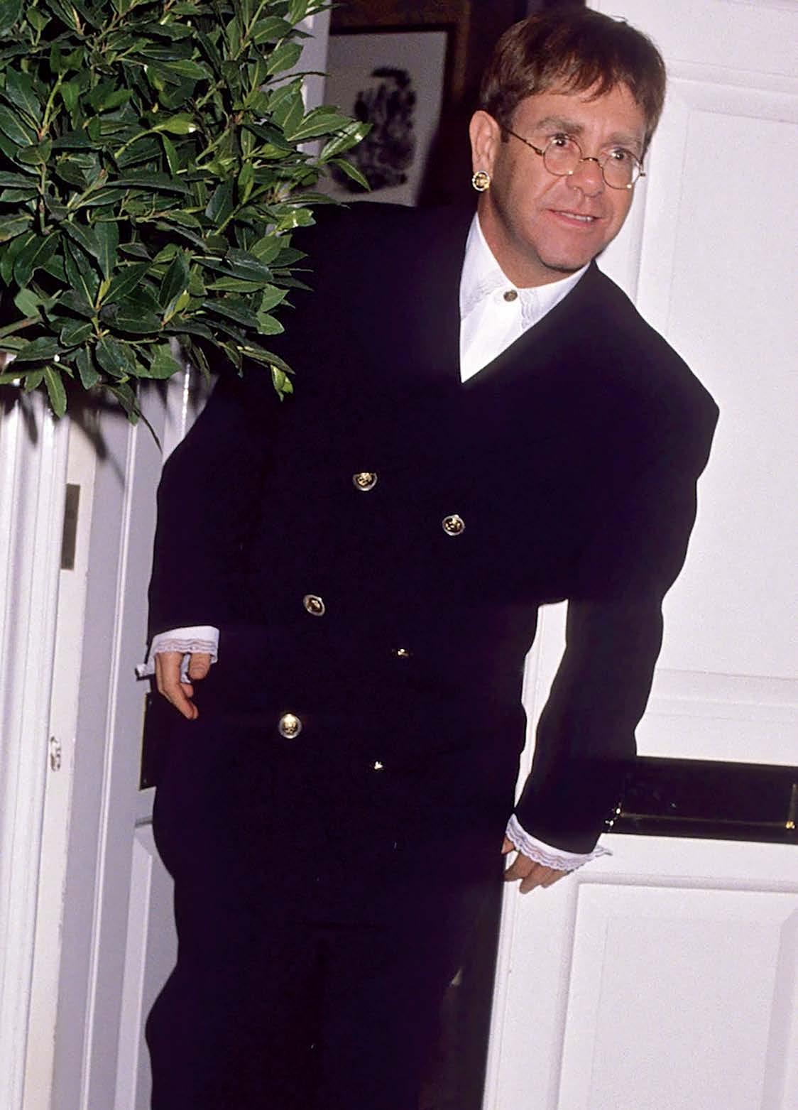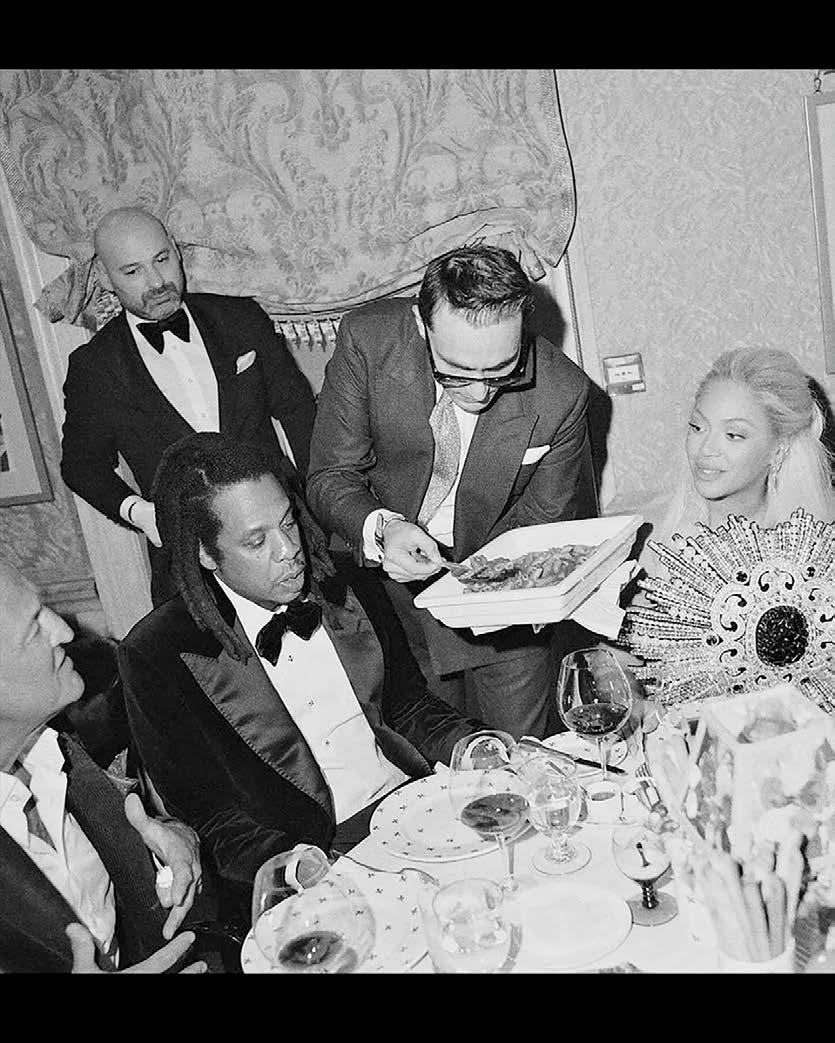 Clockwise from top left: Sir Elton John at Harry’s Bar, 1994; Joan Collins and Roger Moore, 1990; Aerin Lauder, 2023; Jay Z and Beyoncé, 2023. Opposite page, clockwise from top left: Michele Costantini, a sommelier; al fresco dining; the bar area.