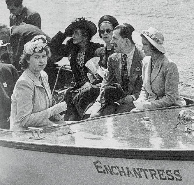 Clockwise from above: Rowing enthusiasts line the banks of the River Thames for the Henley Royal Regatta; former Prime Minister Theresa May in Argonaut on the River Thames at the Henley Royal Regatta, 2019; Queen Elizabeth (then Princess Elizabeth) visits Henley Royal Regatta to mark the introduction of the Princess Elizabeth Challenge Cup, 1946; spectators enjoy the regatta.