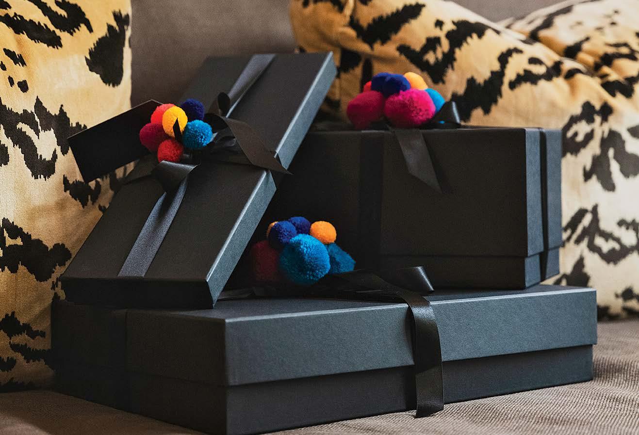 DRIVEN BY A passion for sourcing rare and exquisitely crafted gifts from around the world, Debonnaire von Bismarck founded her eponymous company, Debonnaire, in 2014. Debonnaire offers a curated selection of men’s and women’s clothing, jewelry, small leather goods, home accessories, and embossed luggage tags, all embodying color and fun, essential to the art of gift-giving. Each purchase from Debonnaire is thoughtfully wrapped and adorned with brightly-colored pom-poms. The brand celebrates global designs, featuring embroidered shawls from Nepal, hand-painted leather boxes with personalized artwork from India, handengraved Murano glass, and even Cardinal’s socks from Rome. “When I travel, which I do often, I love finding unique presents for friends and family along the way. They are usually inspired by the places I visit and people I meet,” said von Bismarck. “I’m often asked about the things I wear, so it felt almost completely natural to embark on this journey and create Debonnaire with my business partner Judith Loof.”