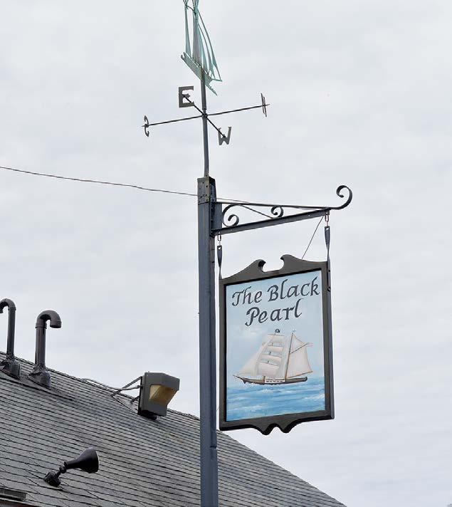 Located in the heart of Newport at 30 Bannister’s Wharf, The Black Pearl is a New England institution. Matthew Cullen, co-owner along with his three brothers—David, Tyler, and Keith—looks out from The Pearl’s Dutch doors with his wife, Maura. In addition to celebrating 50 years of Cullen ownership, Matthew and Maura will soon welcome a new member of the family. Opposite, from above: Matthew enjoys the view from the Patio; a look inside The Black Pearl; The Pearl’s iconic sign and weathervane; outdoor diners enjoying the Pati o.