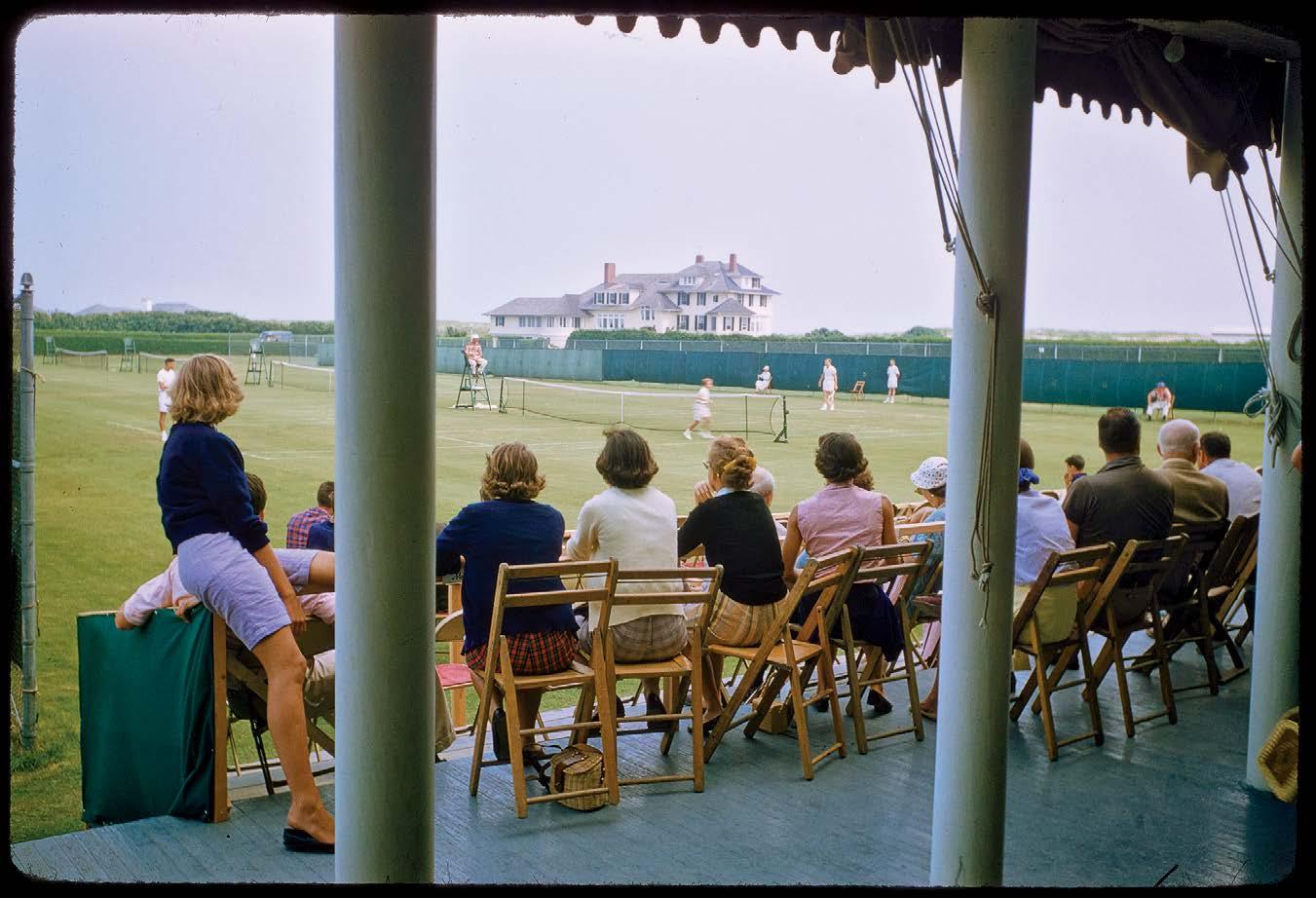 Clockwise from top left: Harold Stirling Vanderbilt watches the HarvardYale Crew Race from aboard his 90-foot yacht, Versatile in New London, Connecticut, 1960; Mrs. John H. G. Pell seated at the Park Avenue Tennis Club, 1933; Sportswoman Gertrude “Gertie” Legendre with her prized Springer Spaniels, 1958; Lili Livi reclining in a boat on Lake Como, Italy, 1955; Tigress, a 1927 catboat featuring a giant American flag, Edgartown Harbor, Martha’s Vineyard; George Plimpton and Sam Snead on a golf outing in Palm Beach, Florida, 1959. Opposite page, clockwise from top: A view from the spectator seats at a private club in Southampton, 1955; Peter Lawford and Reginald Boardman at the Theatre in Palm Beach, circa 1950; Lyford Cay, Nassau, 1960; “Tennis in the Hamptons, Long Island’s chic play spot”, photographed by Toni Frissell for Sports Illustrated, 1955; breakfast at Saratoga Race Track, Saratoga Springs, New York, 1960.