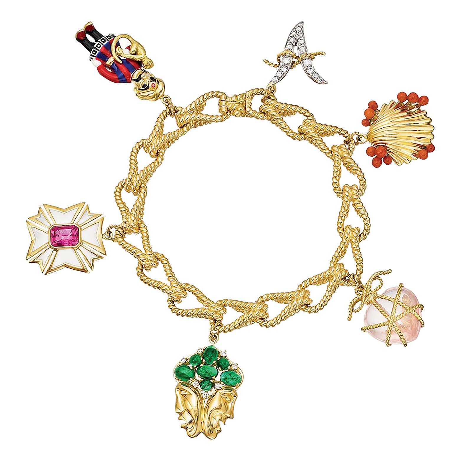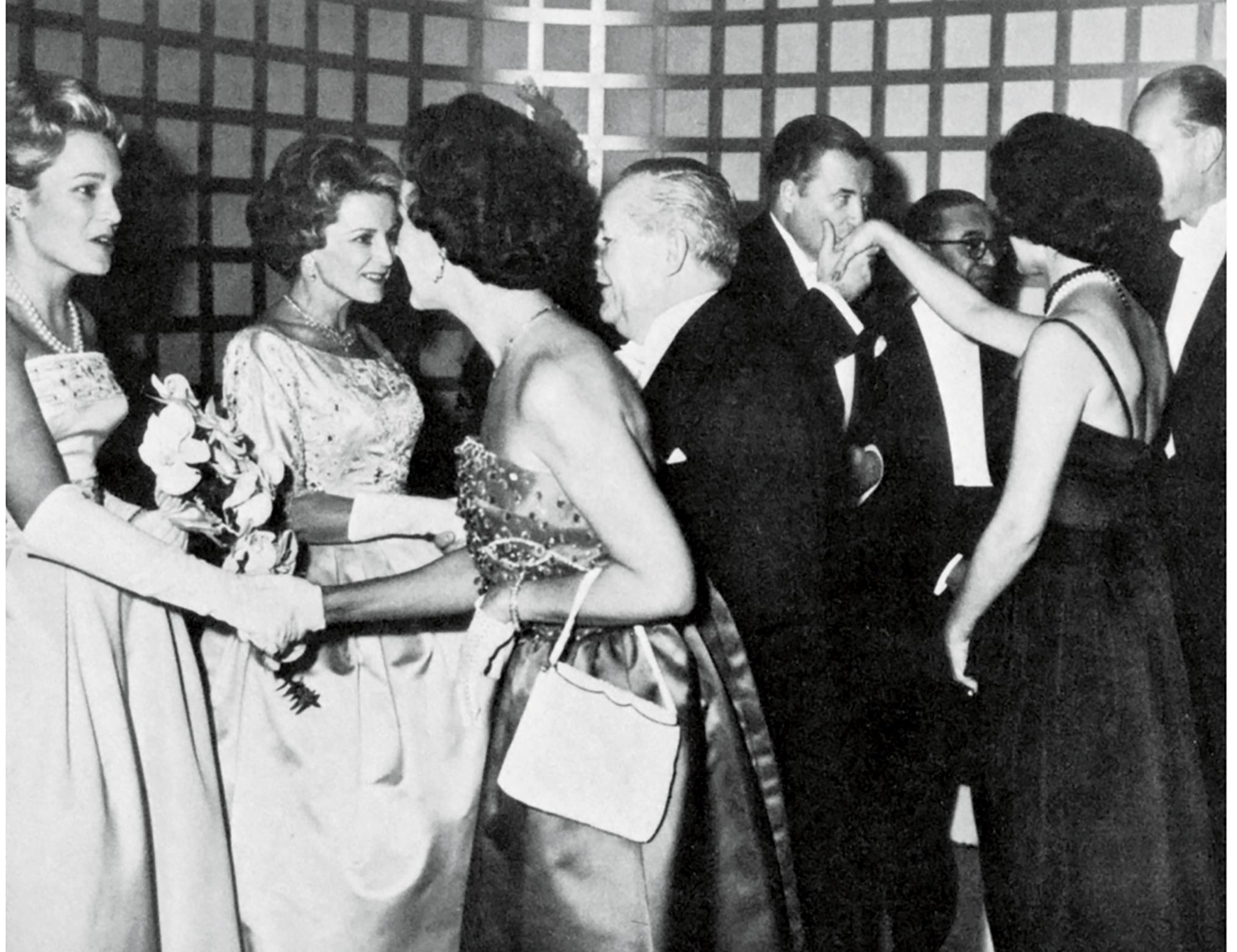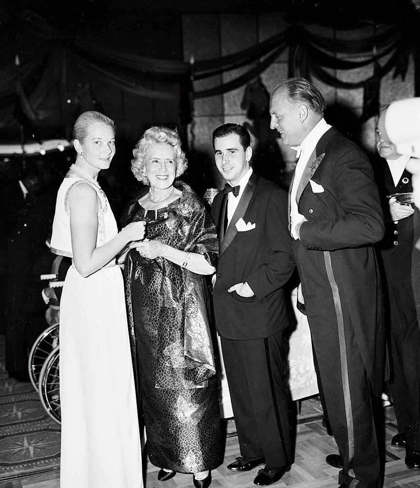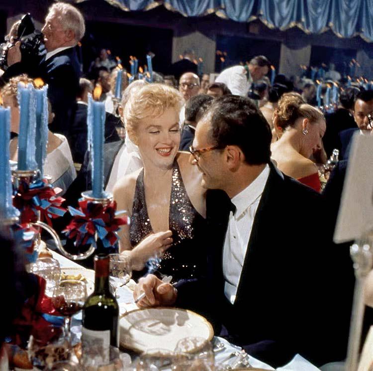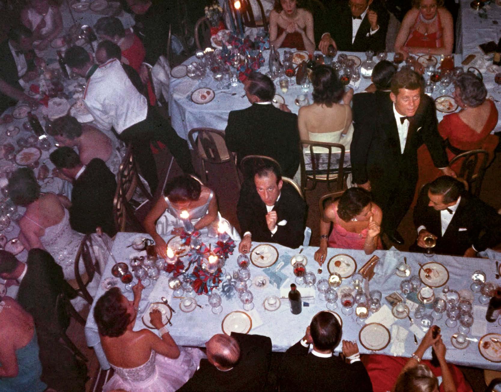 3. Tables at the benefit always included a list of notable attendees, as seen in Slim Aarons’ shot featuring young Senator John F. Kennedy greeting guests in 1959. 4. Mrs. Winston F.C. Guest (“C.Z.”) joins Mrs. Cobina Wright, Enrique Godoy Jr., and Mario Braggiotti at the ball in 1961. 5. Newlyweds Marilyn Monroe and Arthur Miller in 1957.