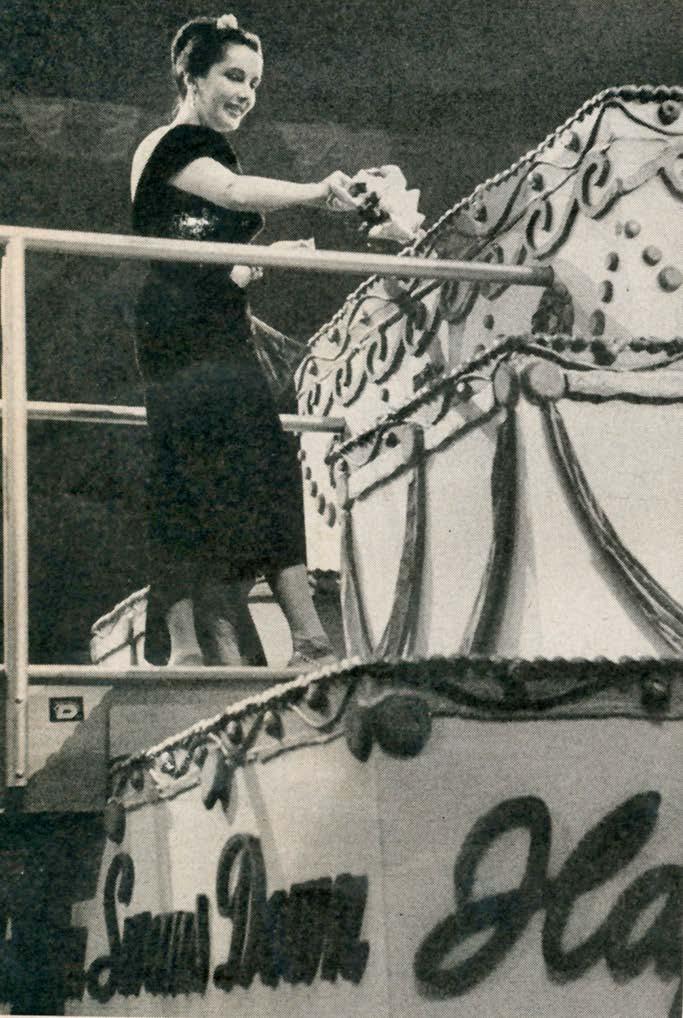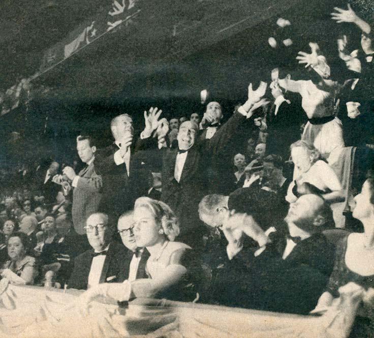1 . Mike Todd rented out all of Madison Square Garden in 1957 to throw a lavish, celebrity-studded party on the first anniversary of his film, Around the World in 80 Days. 2. Approximately 18,000 guests attended the extravagant affair. 3. Elizabeth Taylor, Todd’s wife, cut the first piece of the impressive, 14-foot-high cake. 4. Mike Todd (left) whistled to cue the Boston Pops Orchestra, led by conductor Arthur Fiedler. 5. Feathered Marchers, a 45-piece band from Philadelphia’s Mummers club, was one of 24 bands and two orchestras that performed.