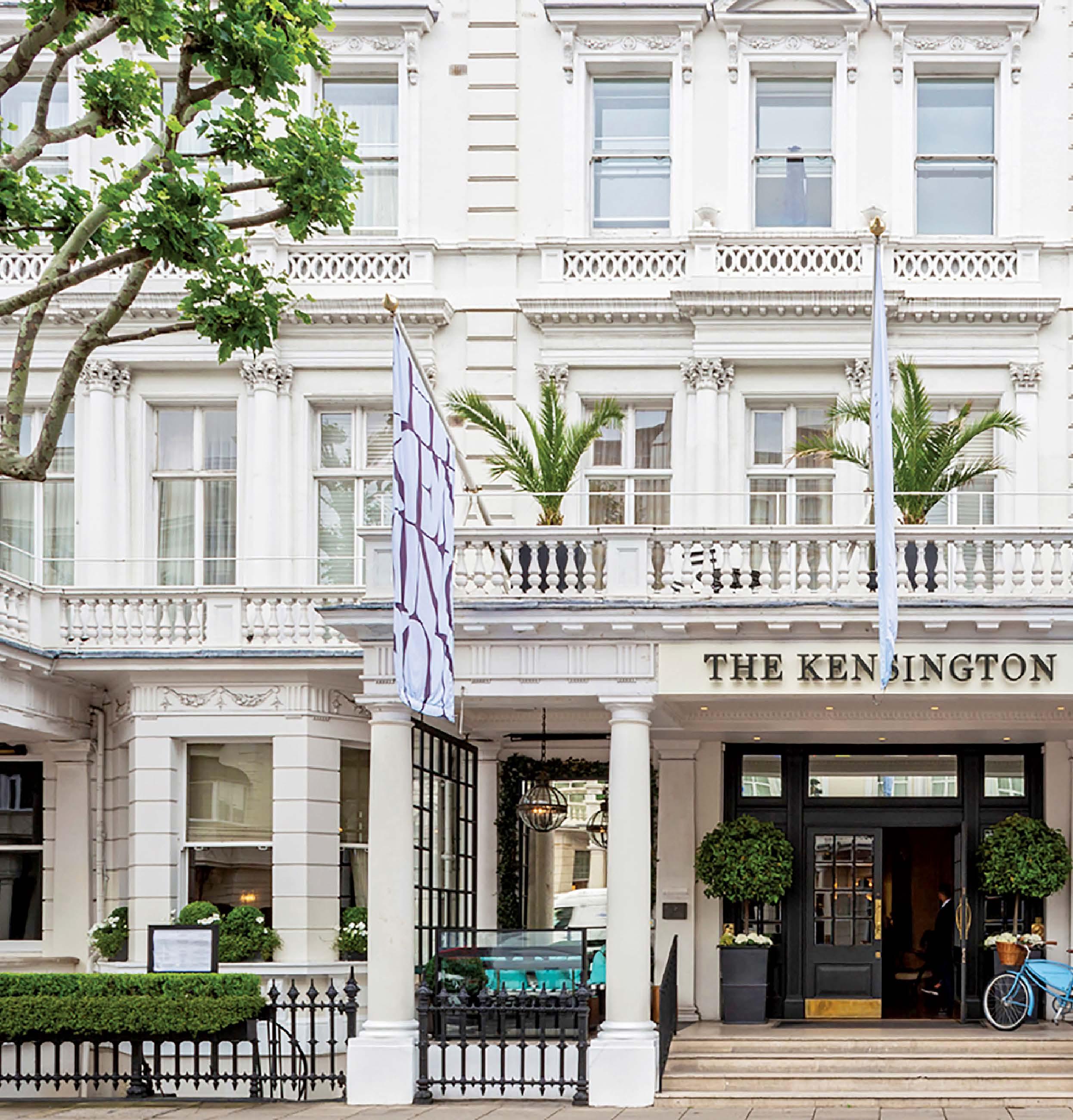 IN A CITY of grand hotels and global chains, The Kensington feels refreshingly personal. Tucked along Queen’s Gate in a row of four 19th-century townhouses, this South Kensington hideaway combines the warmth of a private London residence with the polish of a fivestar stay. Guests are greeted by a bowler-hatted doorman and welcomed into interiors that blend Victorian grandeur—high ceilings, open fireplaces, heritage detailing—with a low-key, members’ club ambiance.