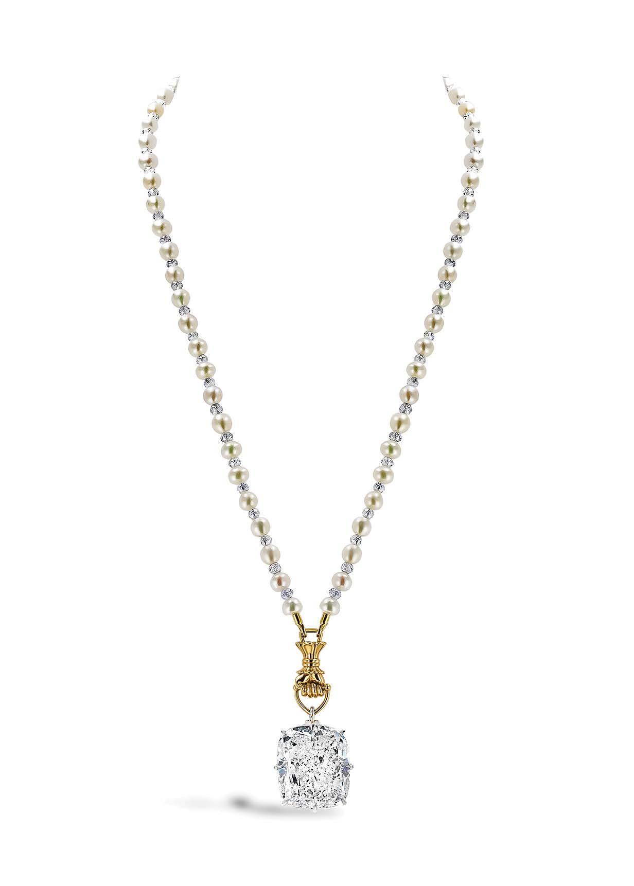 Clockwise: Pragnell’s Masterpiece Honeycomb 34.01ct Diamond Necklace in 18ct Yellow Gold ($245,525); Pragnell is a proud benfactor of The King’s Foundation; Queen Elizabeth II wears the Antrobus bracelet upon greeting Winston Churchill at a Guildhall reception in 1950; applying designs from its Antrobus archives, Pragnell created a one-of-a-kind Antrobus bracelet, inspired by the geometric beauty of the original; Pragnell’s two-story showroom in Leicester. Opposite page, clockwise from above: Pragnell’s Stratford-upon-Avon flagship; Masterpiece Figa Fortune 32.34ct Diamond and Keshi Pearl Pendant in Platinum and 18ct Yellow Gold ($POA); Pragnell’s Stratford-upon-Avon showroom, originally opened in 1954.