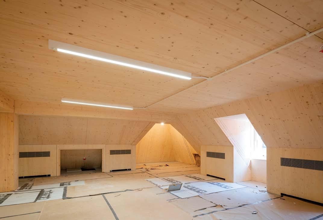 Julia Feix, Feix & Merlin Architects, said: “Because of inevitable concerns about employing a predominantly structural timber design within a building that had suffered a serious fire, elements such as the new CLT floor had to be fire-proofed and assessed and we worked with a Swiss specialist to prove to the London Fire Brigade that a structural timber solution was safe and operational.”