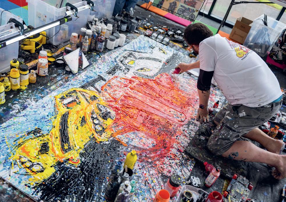 IT’S FAIR TO SAY THAT Ian Cook, better known as PopBangColour, takes something of an unconventional approach to create his automotive artworks. Rather than use brushes, he makes his unique artwork with the wheels of remote-controlled cars.