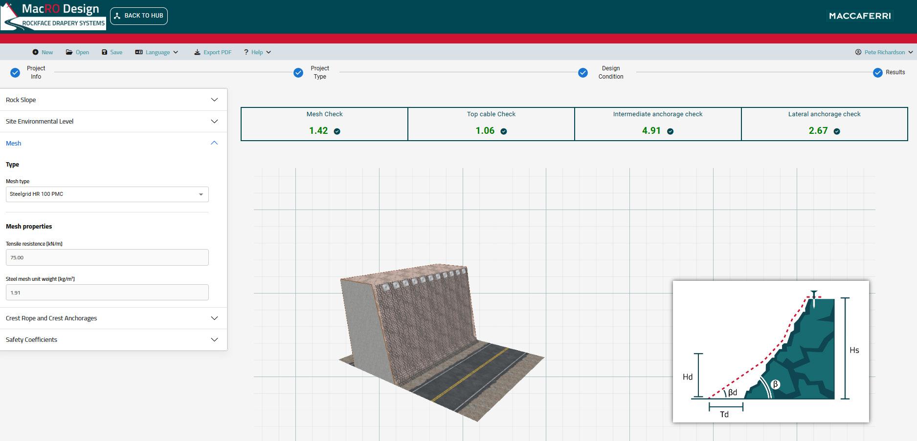 of a safety factor and ‘working rate’ for both the anchors and the netting to enable an economical design; the designer can rapidly swap mesh types to quickly home-in on an efficient mesh/anchor combination, reducing overdesign and cost to clients and the environment.