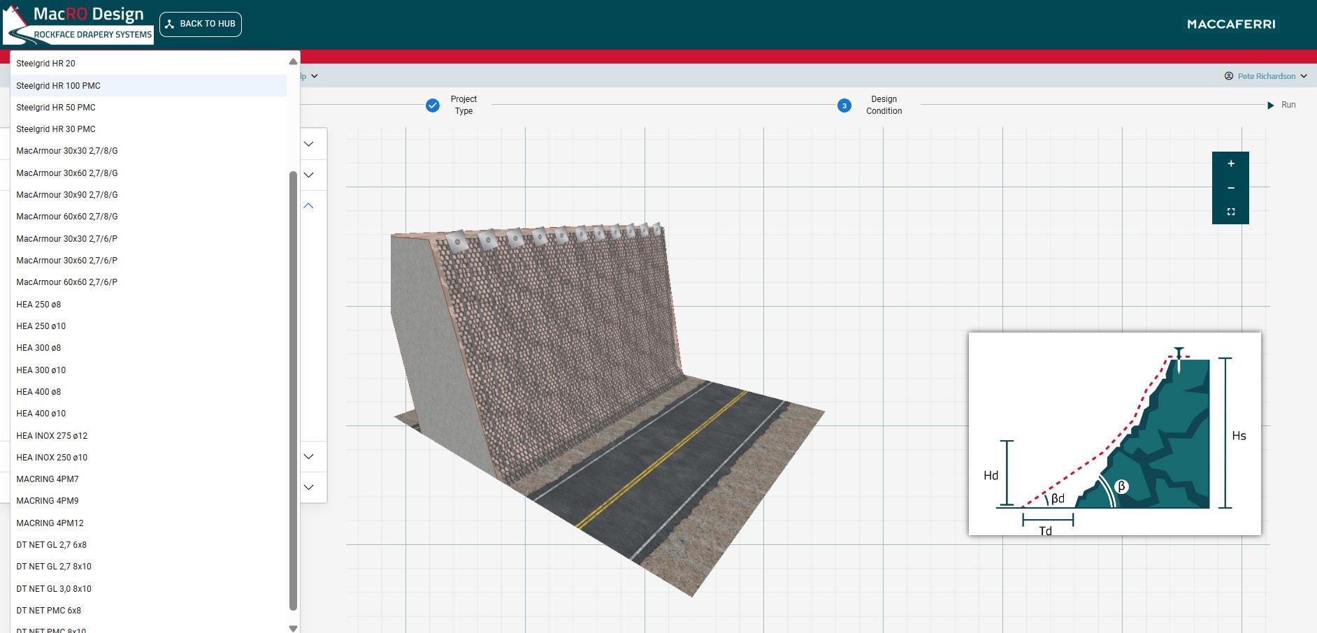 The user selects from the library of rockfall protection netting systems with a variety of protective coatings; the relevant technical parameters for the chosen netting are then automatically used in the design.