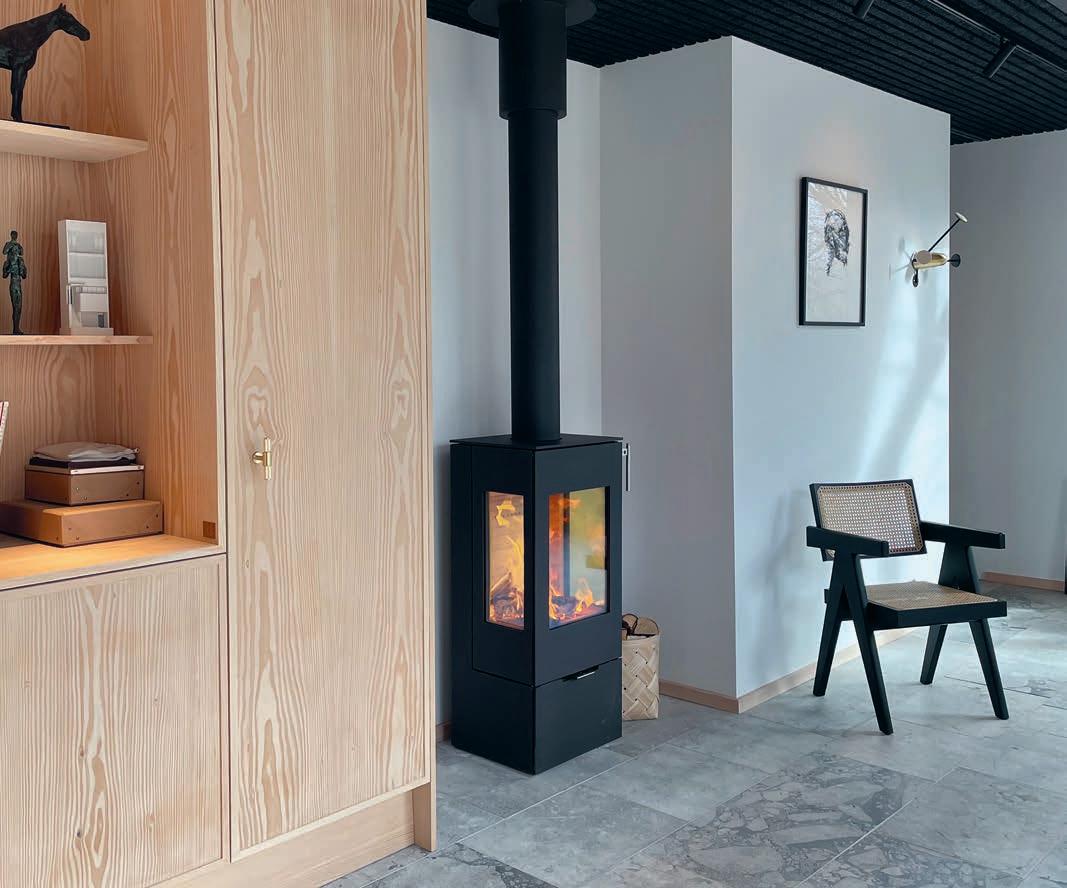Den nye vedovnen erstatter den opprinnelige RAIS 1, som ble installert fra starten. Den nye ovnen har samme stil som RAIS 1 og matcher til fulle boligens særpreg, men har selvfølgelig en vesentlig bedre forbrenning. Og med glass på tre sider gir den ovnen et lettere, mer elegant og tidsriktig uttrykk.