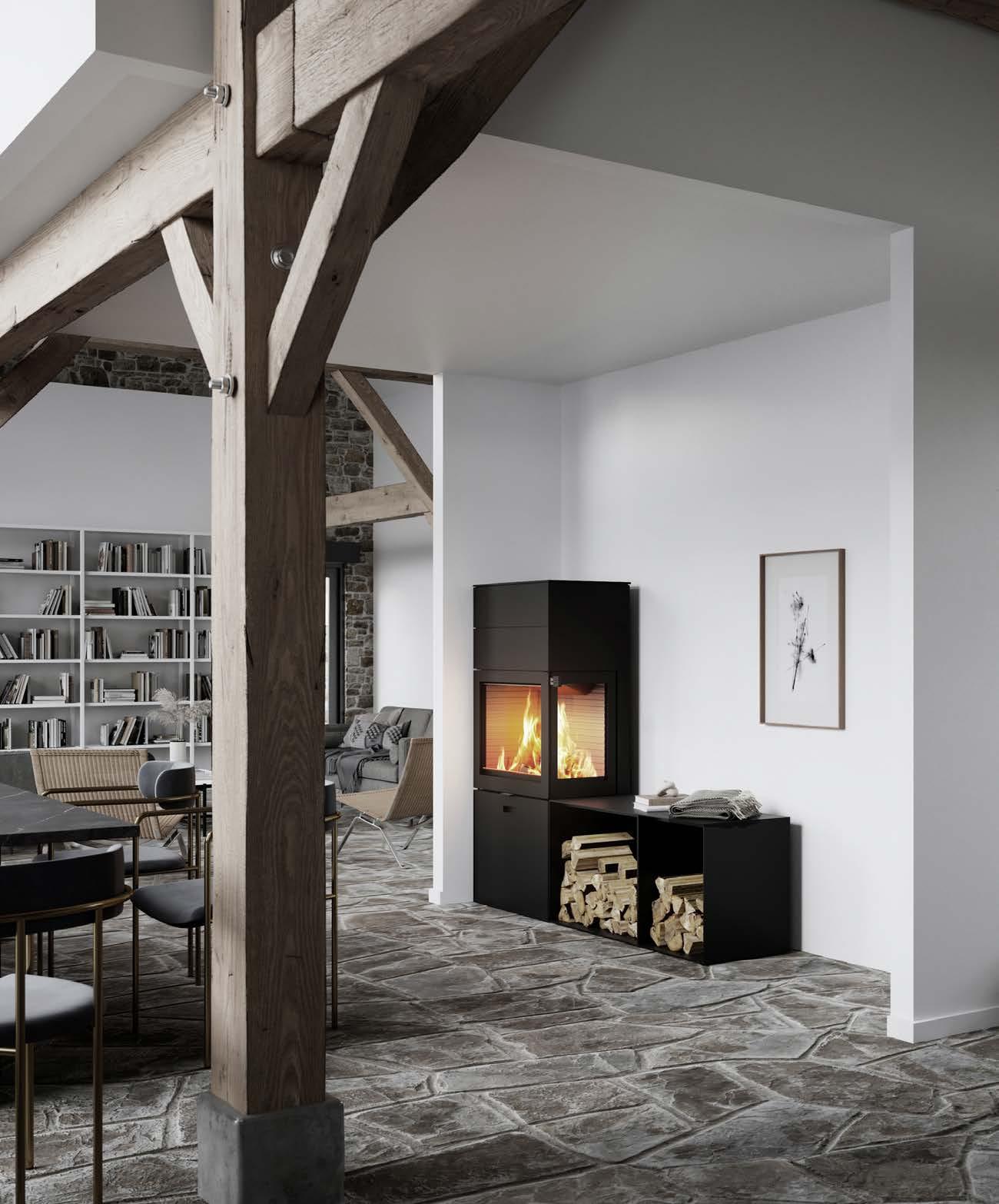 Gjør vedovnen din om til et unikt, flerfunksjonelt møbel ved å legge til én eller flere multibokser til designet ditt. Integrer vedovnen med boksene nøyaktig som du vil, og lag benk, reol eller vedlagring.