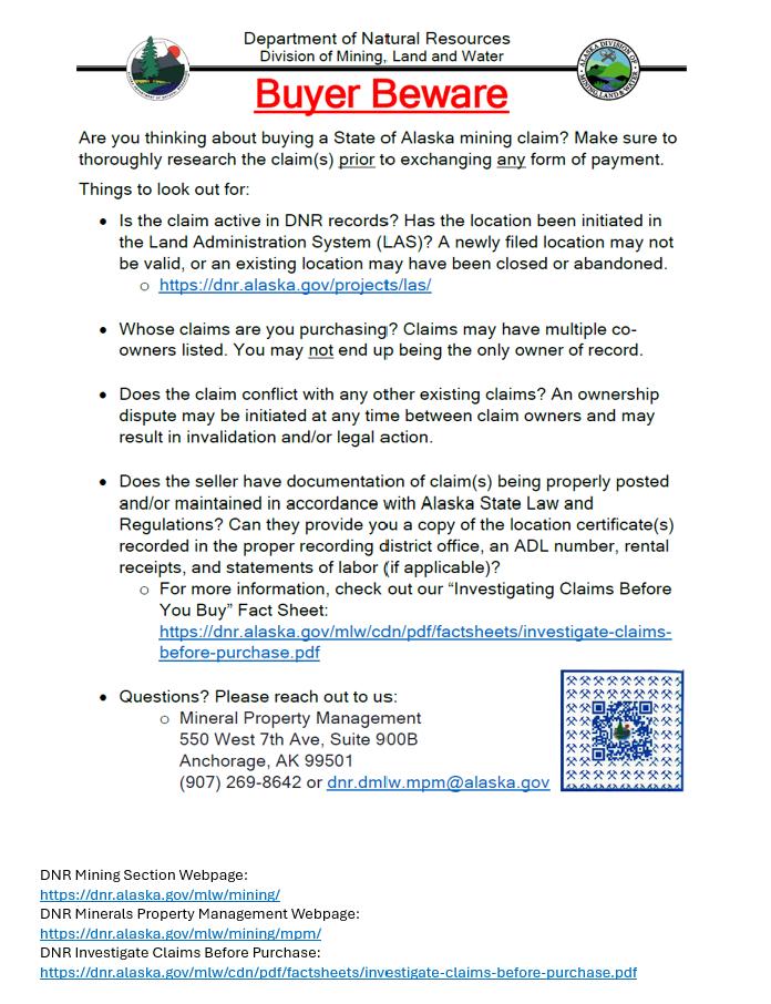 Prospective buyers are strongly encouraged to conduct their own independent due diligence, including but not limited to in-person site inspection, verification of property boundaries, assessment of mineral rights, environmental considerations, permitting requirements, and any other factors material to their purchase decision. The property is sold as is with no guarantees, warranties, express or implied, including but not limited to the existence, presence, quality, or extractable mineral resource.