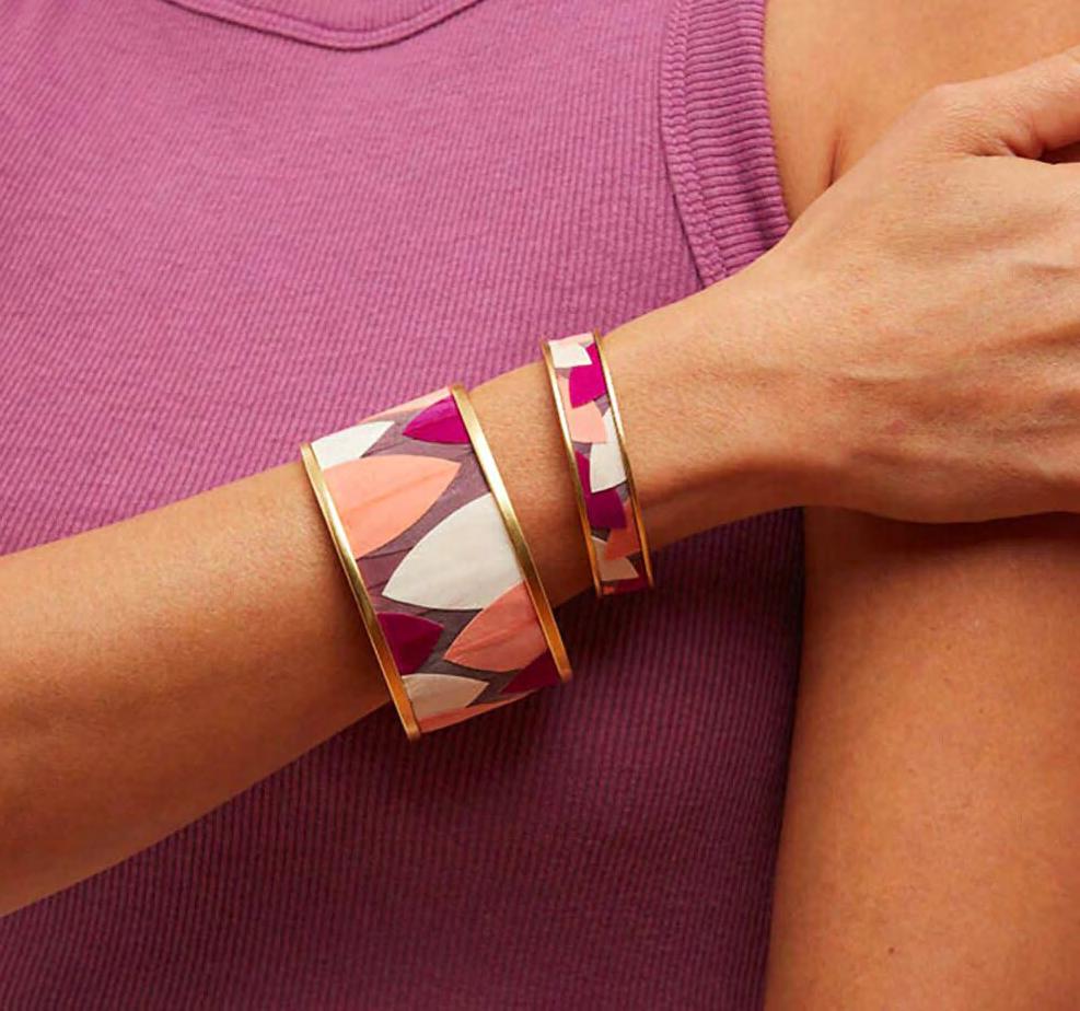 No dyes are used, giving each cuff a unique coloring. Wide cuffs are 1.5” wide and 7" in circumference. Cuffs are completely adjustable to fit any wrist size. Each cuff is crafted with 24k gold plated, nickel free hardware.