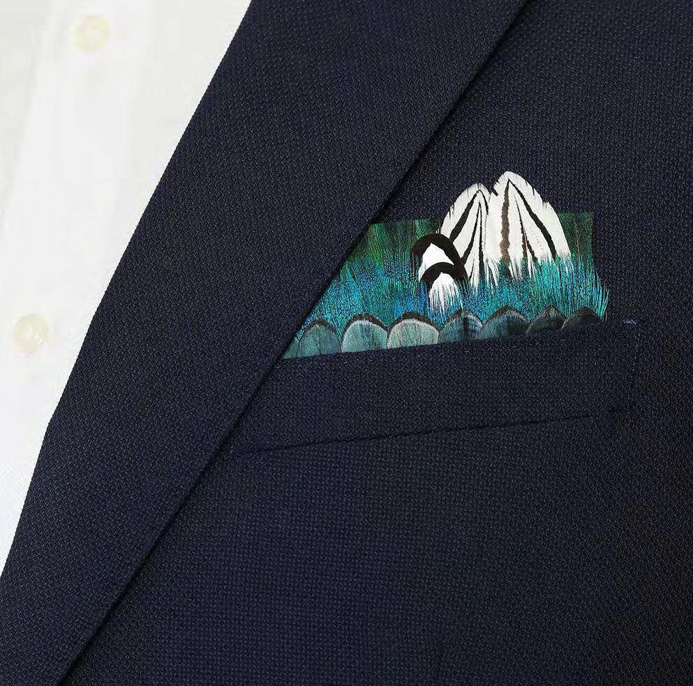 Gaboon is a textured pocket square crafted with emerald green and royal peacock and navy, black, and white pheasant feathers.