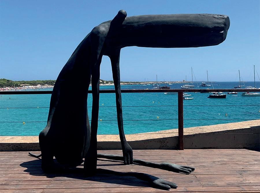 the renowned art collector Lio Malca's Fundación La Nave Salinas in Ibiza, Spain. Founded in 2015, Fundación La Nave Salinas has not only hosted solo exhibitions for famous US street artists such as KAWS, Keith Haring, and Kenny Scharf, but it has also featured installations and performances for video artists Bill Viola and Marco Brambilla. Macarrón was the first Spanish artist to put on a solo exhibition at Fundación La Nave Salinas. Titled El Bañista, the exhibition showcased 15 paintings and sculptures about Ibiza's signature summer and ocean landscapes. Located in an old-fashioned building, the foundation displays a chapellike divinity that highlights the contrast between the simple space and Macarrón's colorful paintings in creating a festive atmosphere of splendor.