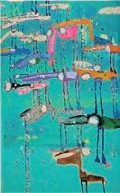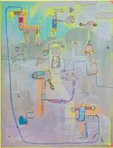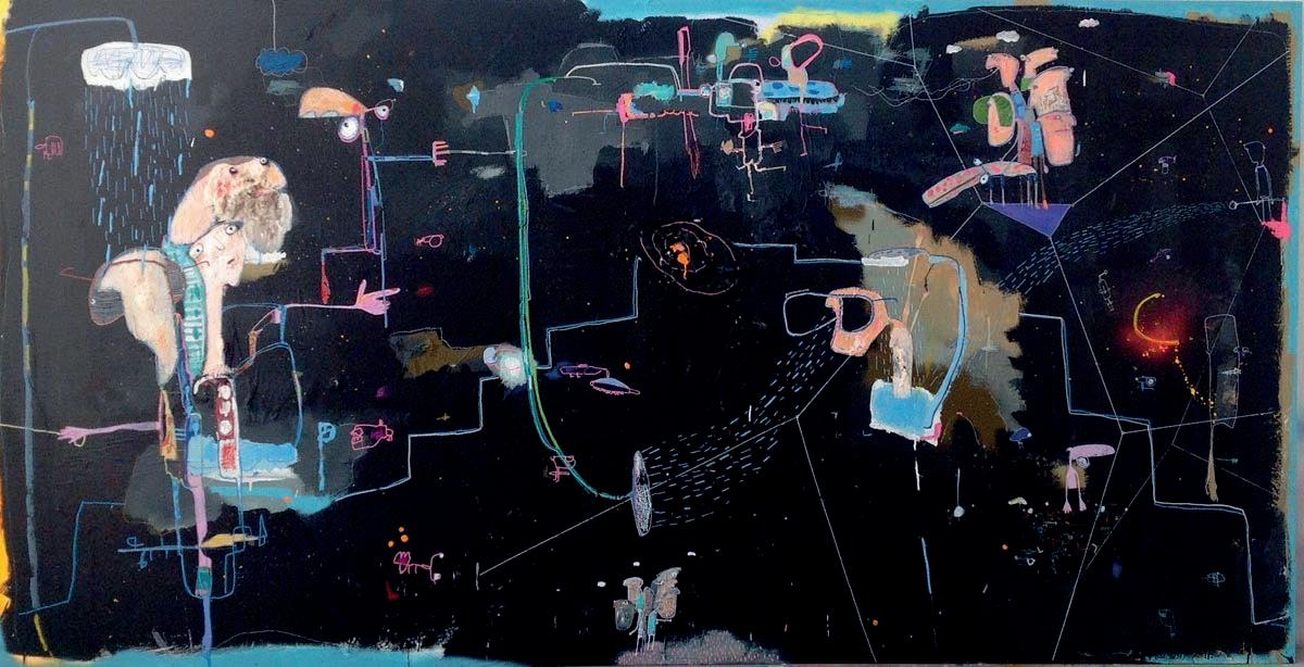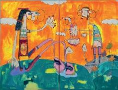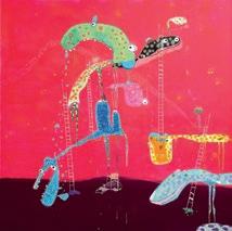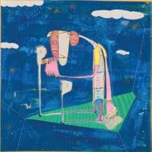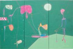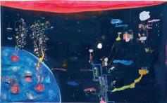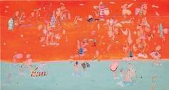都有藝術家如遊戲一般地淋漓暢快的揮灑。他建構的多重空間裡,有的 如虛構的室內,有的如在泳池、沙灘邊,或是某個不知名的高峰、星球