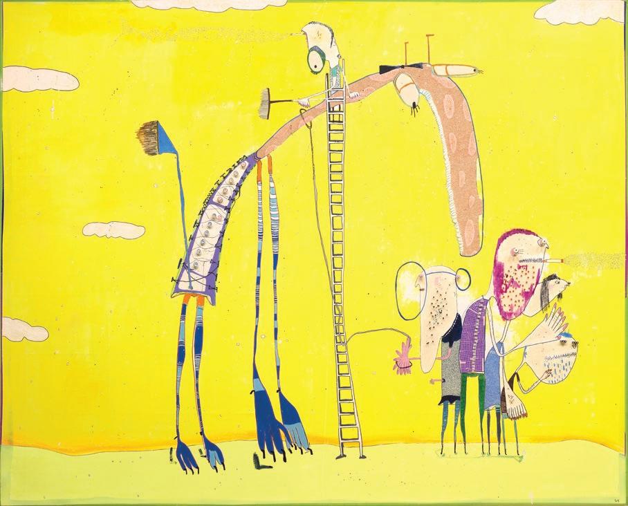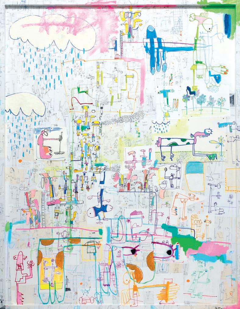 之上,雲朵、雨水、高塔、長梯、飛行器⋯等等夢幻的元素。人物、動 物都有獨特個性,彼此間的互動、手勢的傳達、突出眼球的四處張望狀