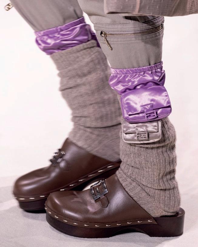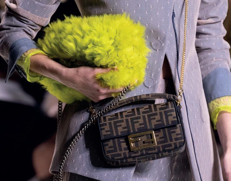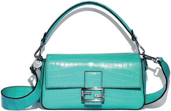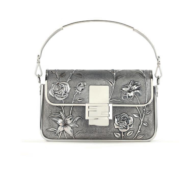 Baguette 包款拱為時尚經典 中的代表。 為慶祝 Baguette 提包款誕生 25 周年, FENDI 選在時尚之都紐約作 秀,無疑也是向流行文化歷史上奠定地位的 Baguette 提包致敬和造勢 的機會。於是, Baguette 提包變成一個「迷你版」的多口袋,無處不在, 貫穿全場。出現在貂皮或亮面皮革派克大衣和絲緞長筒靴上;而暖手套、 毛線帽、裙子、毛衣和後背包上的 Baguette 包分身;充滿裝飾藝術的 魅力。 更不用說 Baguette 也促成「 Fendi at Tiffany's 」兩大品牌的聯名合 作。在紐約立業的傳奇著名珠寶 Tiffany & Co. ,以純銀、琺瑯、鱷魚皮、 白 K 金和鑽石和經典 Tiffany Blue 「知更鳥藍色」的亮面鱷魚皮,將 Baguette 包推上重奢華的極致。最令人驚豔的是一款全由紋理純銀材質 製成的 Baguette 包款。上面刻有分別代表義大利與紐約州的百合花和 玫瑰花。這也是 FENDI 「 Hand in Hand 」手工製包企畫案中首件來自 義大利以外的卓越工藝。 此外, Baguette 提包同時也出現搭配同色皮革肩帶,一改過去手 拿,肘夾的使用方式;某種程度,你也可以說, FENDI 與時並進,讓 現代女性適時騰出兩隻手來,充分掌握自由自在「做自己」的時尚進化。 經典工藝 BAGUETTE 貝貴提包 52