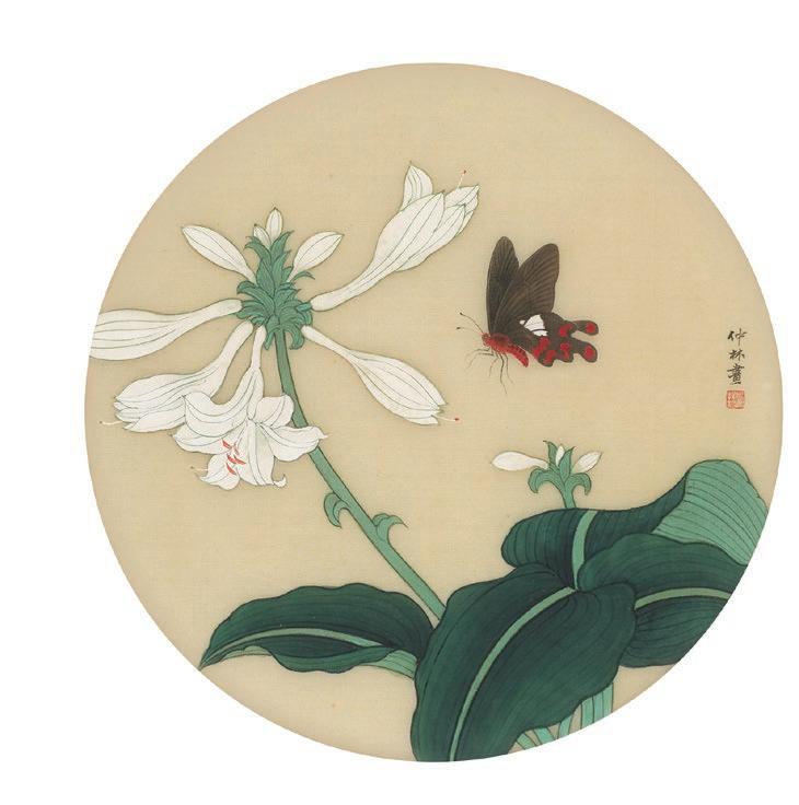 ▲ 喻仲林《玉簪花及雪中鴛侶(兩件一組)》 水墨 設色 絹本 鏡框 直徑: 33 cm ; 35 cm 羅芙奧 2022 秋拍 台幣 50,000 - 100,000 YU Chung-lin, Tube Roses and Butterfly and Mandarin Ducks on Wintry Tree (A Set of Two), Ink and colour on silk, framed, D: 33 cm; 35 cm Ravenel 2022 Autumn Auction, US$ 1,600 - 3,200 34