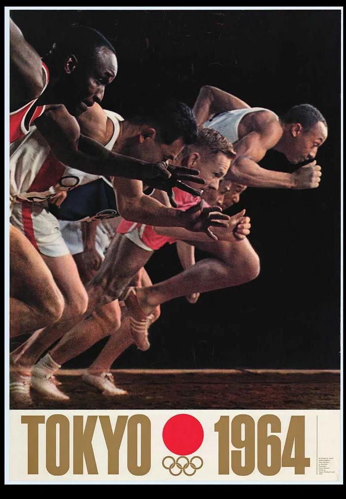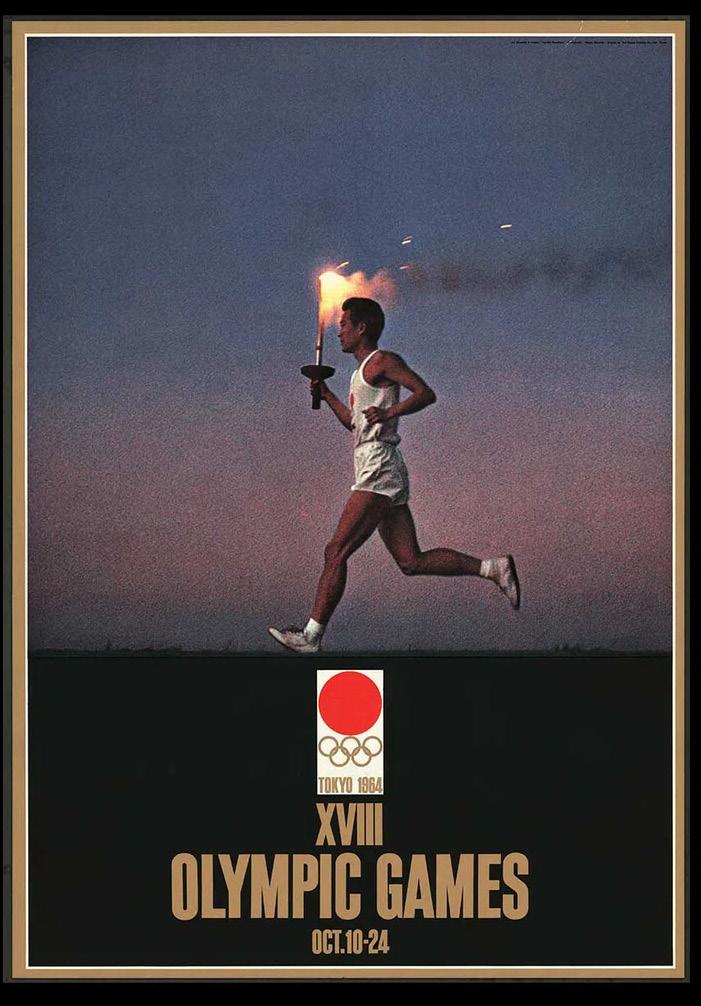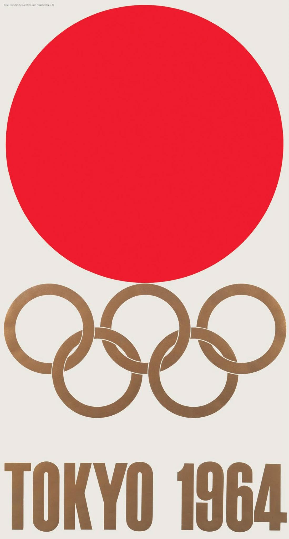 “It recalls the official emblem, composed of the Olympic rings superimposed on the emblem of the Japanese national flag, representing the rising sun. There was a total of four official posters, all designed by Yusaku Kamekura. They were all made by photoengraving using several colours, highlighting the technology of the Japanese printing industry. The posters themselves received a number of prizes for their excellence, including the Milan Prize for poster graphics.100,000 copies were made.” - The Olympics