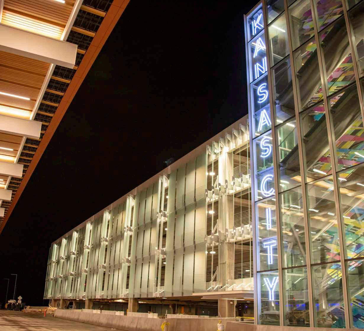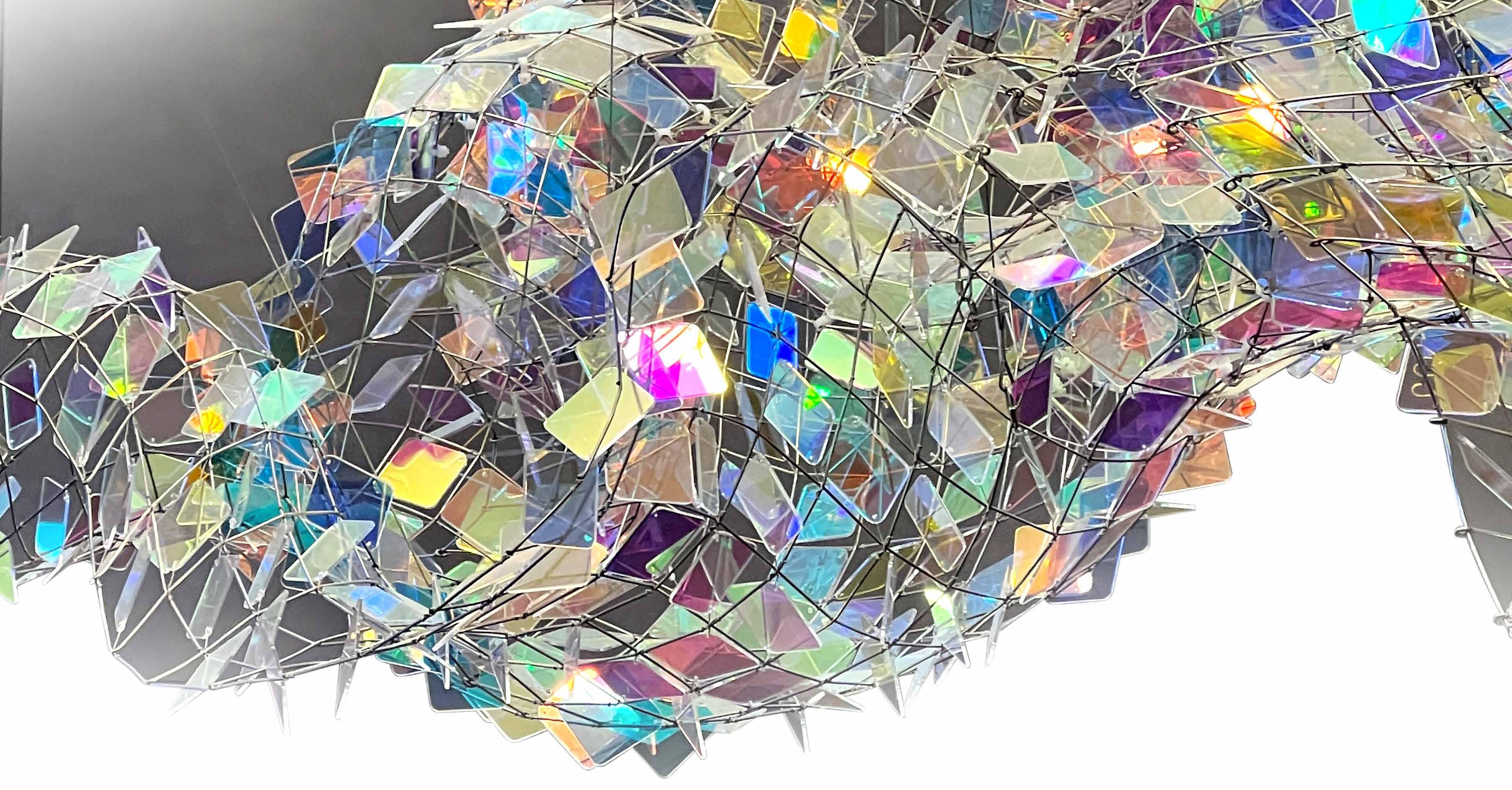 Soo Sunny Park’s shimmering Molten Swing looks ethereal. Suspended in flight down to baggage claim, the undulating facets of glass and plastic manipulate the light as it twines through chain link fencing. Park’s research led her to construct this piece as an ode to Bennie Molten’s big band history in Kansas City. Photo courtesy of BuildKCI and Kansas City Aviation Department.