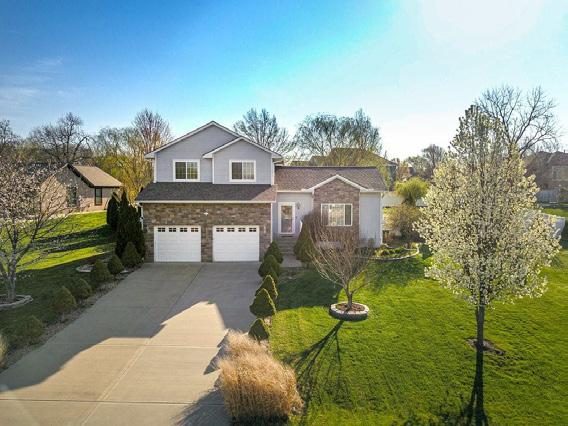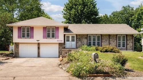 2110 NW Sycamore Lane in Rosewood Hills, Grain Valley. Stunning split-entry home with 4 beds, 3 baths, soaring ceilings, and a fenced yard. Updated with stone fireplace, custom kitchen, hardwood floors. Lower level has a bedroom and full bath, ideal for guests or home office. $405,000 | MLS #2452701