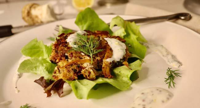 Place 2-3 cakes on a bed of assorted greens. Drizzle with the tarter sauce. Serve warm.