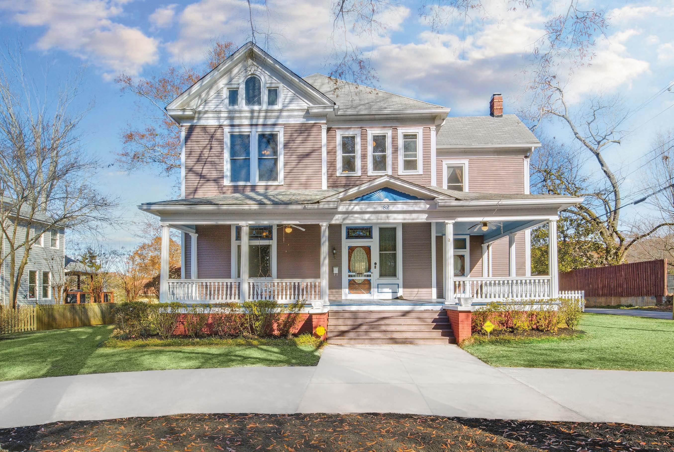 COLE SEWELL HOME, CIRCA 1905. Own a piece of history in Historic Downtown Newnan’s Cole Town. Beautiful two-story home on a half-acre with high ceilings, original hardwood floors, stained-glass windows, gorgeous crown molding, period light fixtures, custom columns, clawfoot tubs, multiple fireplaces, screened porch, sun room, brick walkways, and detached garage. Unique property with potential for Bed and Breakfast or incomeproducing property. Circular driveway. Walk to the historic Court Square in downtown Newnan and the CJ Smith Park. Estate-owned property sold “as-is”. $549,900.