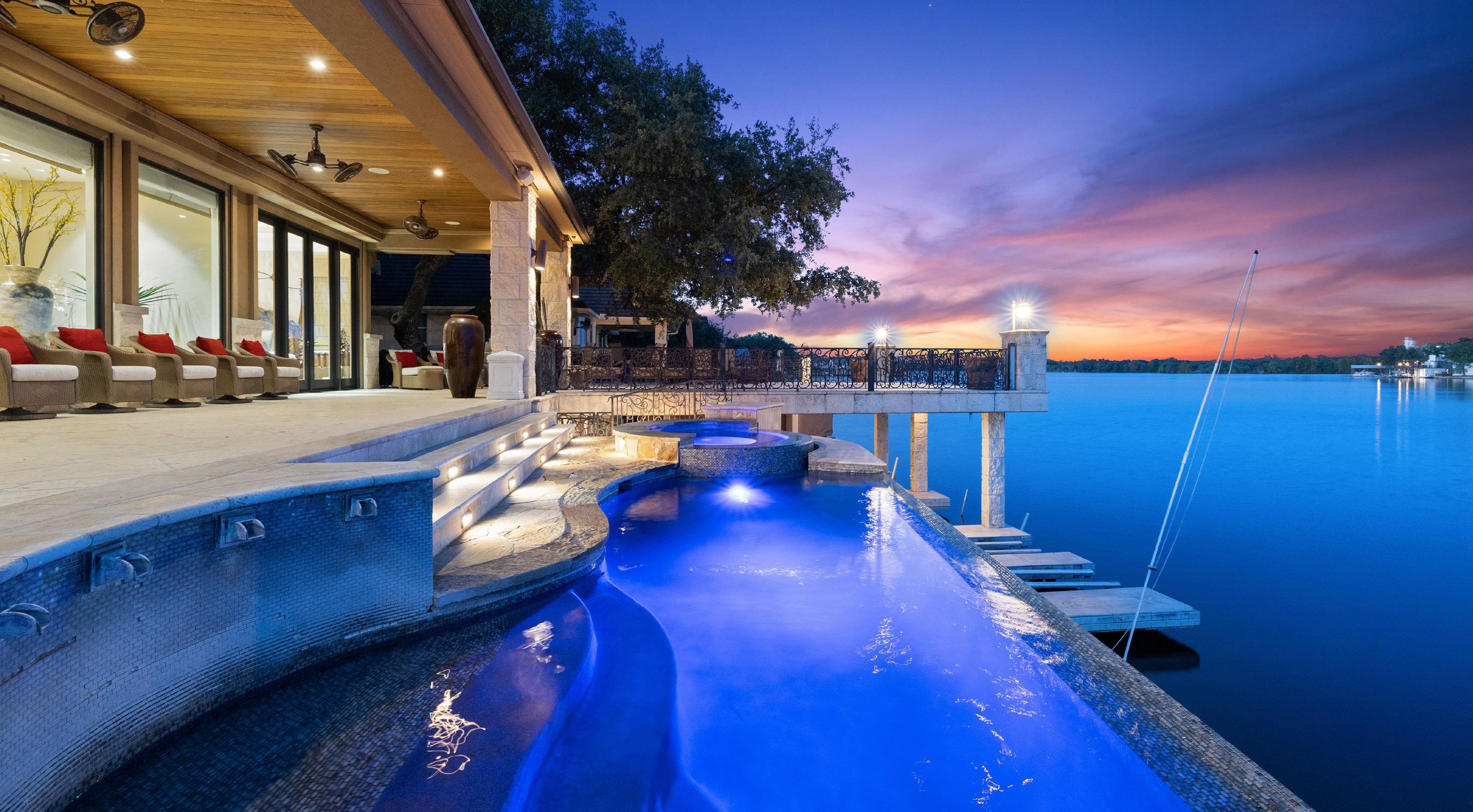 Discover the epitome of Lake LBJ waterfront luxury! This 3.3-acre estate in the gated golf & waterfront community of The Legends offers 250’ feet of breathtaking open waterfront. It features a stunning blue negative-edge pool with a spa and slide, a spacious covered patio, and an extraordinary man cave with a full bar, pool table, and ice cream station. The multi-generational design includes an open-concept main living area, a gourmet kitchen, a theater room, a primary suite with a spa bath, and multiple guest suites. The beautifully landscaped grounds lead to lakeside entertaining areas, a summer kitchen with a BBQ/fire pit, and a boathouse with living quarters and amenities. Constructed in 2020, this 9,788 sq ft estate includes eight bedrooms, nine full baths, two half baths, a five-car garage, offered fully furnished with watercraft, ready to start living your best life on Lake LBJ!