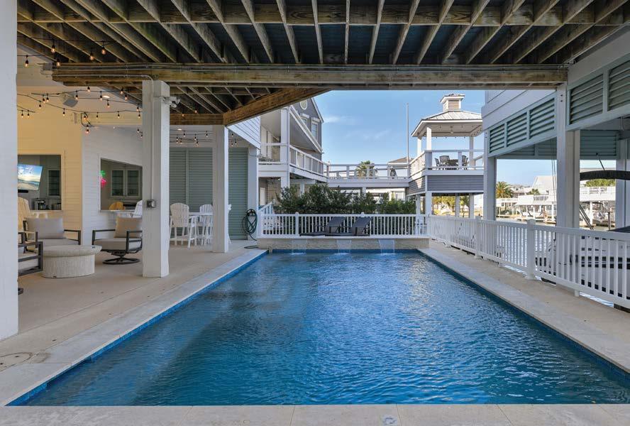 This beautiful waterfront property has everything you would expect for island living! The open floor plan includes an island kitchen with farmhouse sink, Monogram gas range, separate ice maker, ample storage space, walk in pantry with laundry room, plus a dry bar with wine fridge. The kitchen/dining combo opens to the living room & breakfast nook with built-in bench seating. The spacious primary suite boasts gorgeous views, while the primary bath offers custom barn doors, soaking tub, separate shower and two closets. Two guest bedrooms with ensuite baths, plus a half bath, are also on the main level. Upstairs you will find a unique space which includes a family room with built-in bunk beds, a game area, guest bedroom, and an oversized bathroom with dual shower and triple sink vanity. Downstairs, enjoy entertaining in your pool year-round with a heater & chiller.