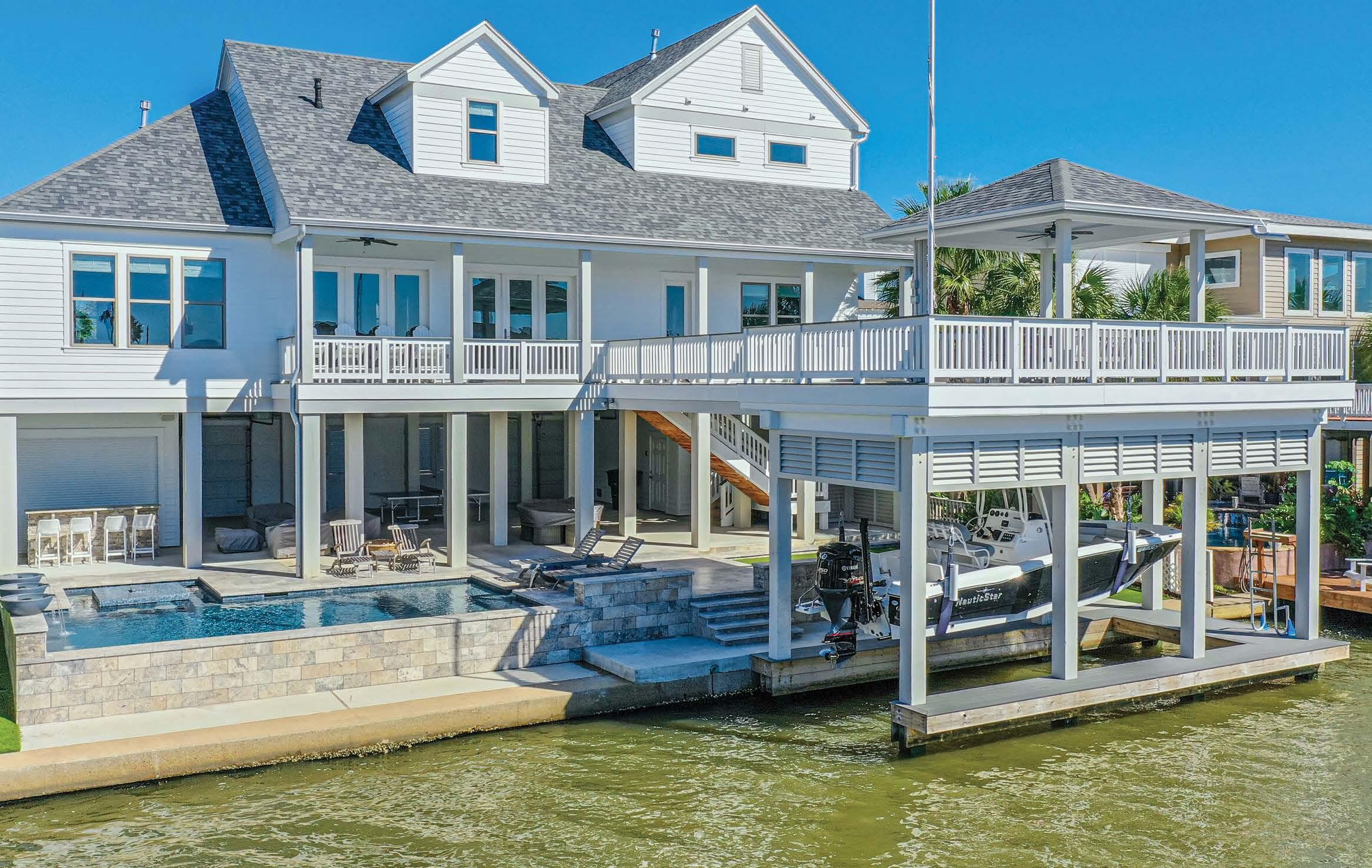 Great Location + Fantastic Floorplan = 3513 Muscatee. Located on one of the widest canals in Pirates Cove, with a very short walk to the Galveston Country Club, making a morning golf game and afternoon fishing a breeze. The home offers 4 bedrooms & 2 bathrooms on the main floor with a large primary suite upstairs. All of the bathrooms have been renovated with quartz countertops and tile surround shower walls. The spacious open living space features large picture windows & coastal light stained pine flooring. The updated kitchen includes pots/pans drawers, quartz countertops, glass tile backsplash and gas range. Other features to get excited about are high ceilings, large picture windows, exterior shutters, large pool, outdoor kitchen, expansive outdoor entertaining spaces, cargo lift and fully fenced yard. Other recent updates include boat dock, roof, carpet, exterior paint, and PEX plumbing. Conveys furnished with exclusions!