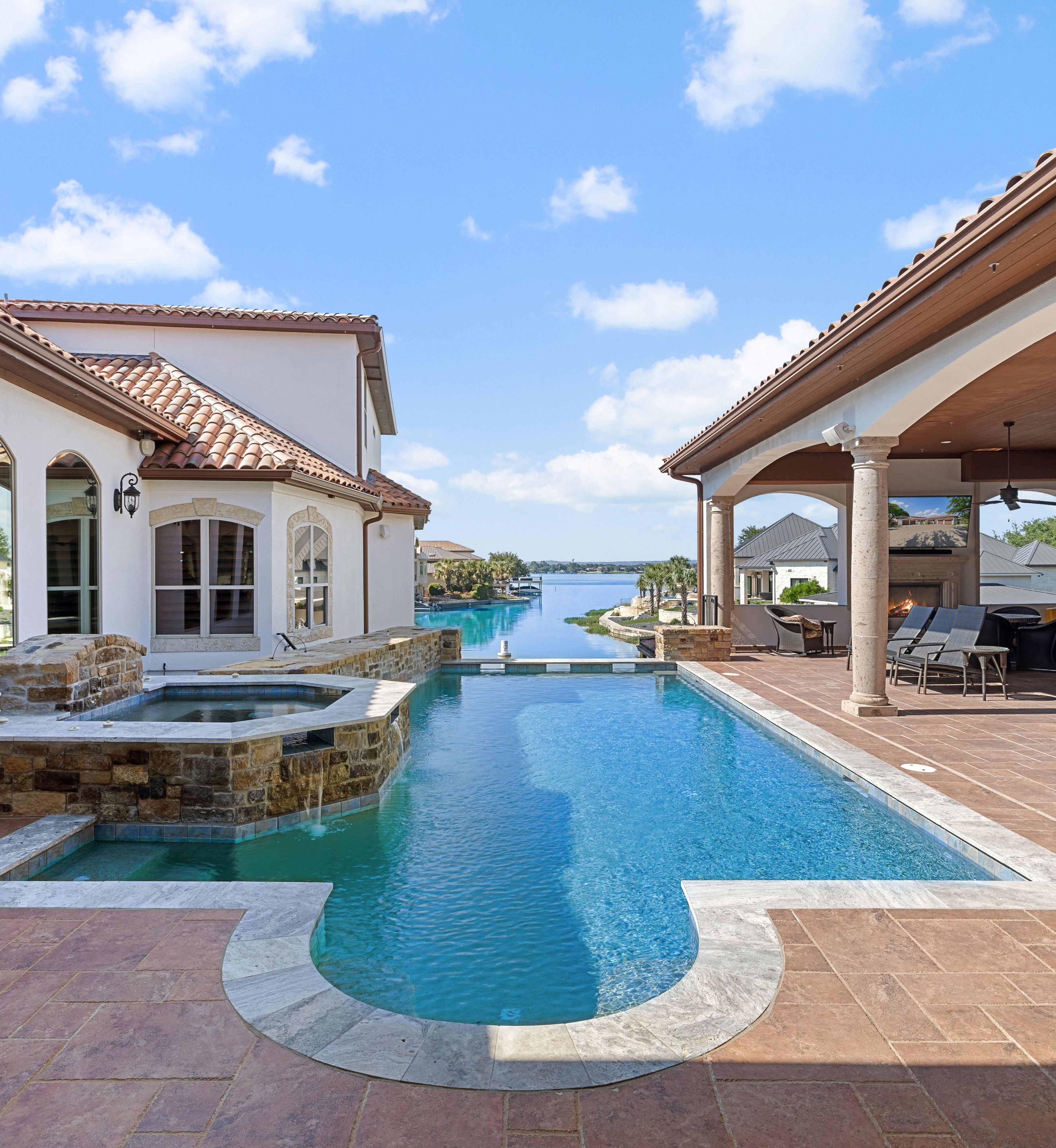 Discover the epitome of Lake LBJ waterfront luxury! This 3.3-acre estate in the gated golf & waterfront community of The Legends offers 250’ feet of breathtaking open waterfront. It features a stunning blue negative-edge pool with a spa and slide, a spacious covered patio, and an extraordinary man cave with a full bar, pool table, and ice cream station. The multi-generational design includes an open-concept main living area, a gourmet kitchen, a theater room, a primary suite with a spa bath, and multiple guest suites. The beautifully landscaped grounds lead to lakeside entertaining areas, a summer kitchen with a BBQ/fire pit, and a boathouse with living quarters and amenities. Constructed in 2020, this 9,788 sq ft estate includes eight bedrooms, nine full baths, two half baths, a five-car garage, offered fully furnished with watercraft, ready to start living your best life on Lake LBJ!