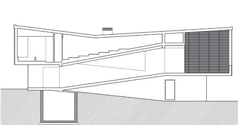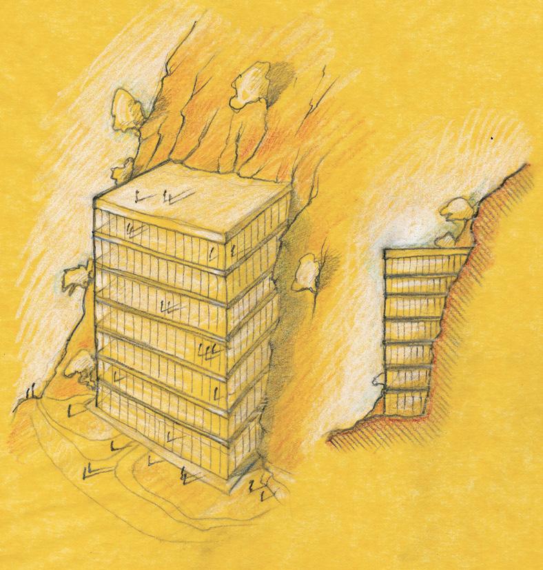 Un alto edificio vetrato si appoggia su una parete rocciosa. Durante i tramonti nelle limpide serate autunnali, quando il cielo è intriso di colore e l’aria rarefatta, il sole impregna di rosso la roccia, dandole ancor più peso e spessore. L’edificio, invece, proprio grazie alla luce che lo colpisce e lo attraversa quasi orizzontalmente penetrandone in profondità gli spazi, sembra smaterializzarsi e assumere, grazie all’intricato gioco di riflessi, uno stato liquido o gelatinoso. Per chi di noi si trova all’interno, il piano di riferimento è quello della calda roccia verticale, e non quello della terra su cui poggia la struttura, facendoci così sentire sospesi non di fianco ma al di sopra della possente rupe, come se stessimo galleggiando.