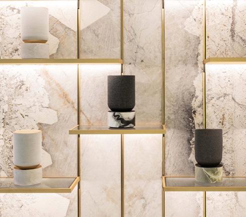 BEOSOUND BALANCE NATURA. Dalla collaborazione tra il marchio italiano e l’azienda svedese, nell’ambito della sua offerta Atelier Bespoke, è nato l’altoparlante disponibile in una selezione di materiali, come il natural quartz della Exclusive Collection e il legno pietrificato della Precioustone Collection. L’anello in alluminio anodizzato posto tra il basamento e lo speaker bilancia gli elementi naturali e quelli ingegnerizzati. www.antolini.com www.bang-olufsen.com