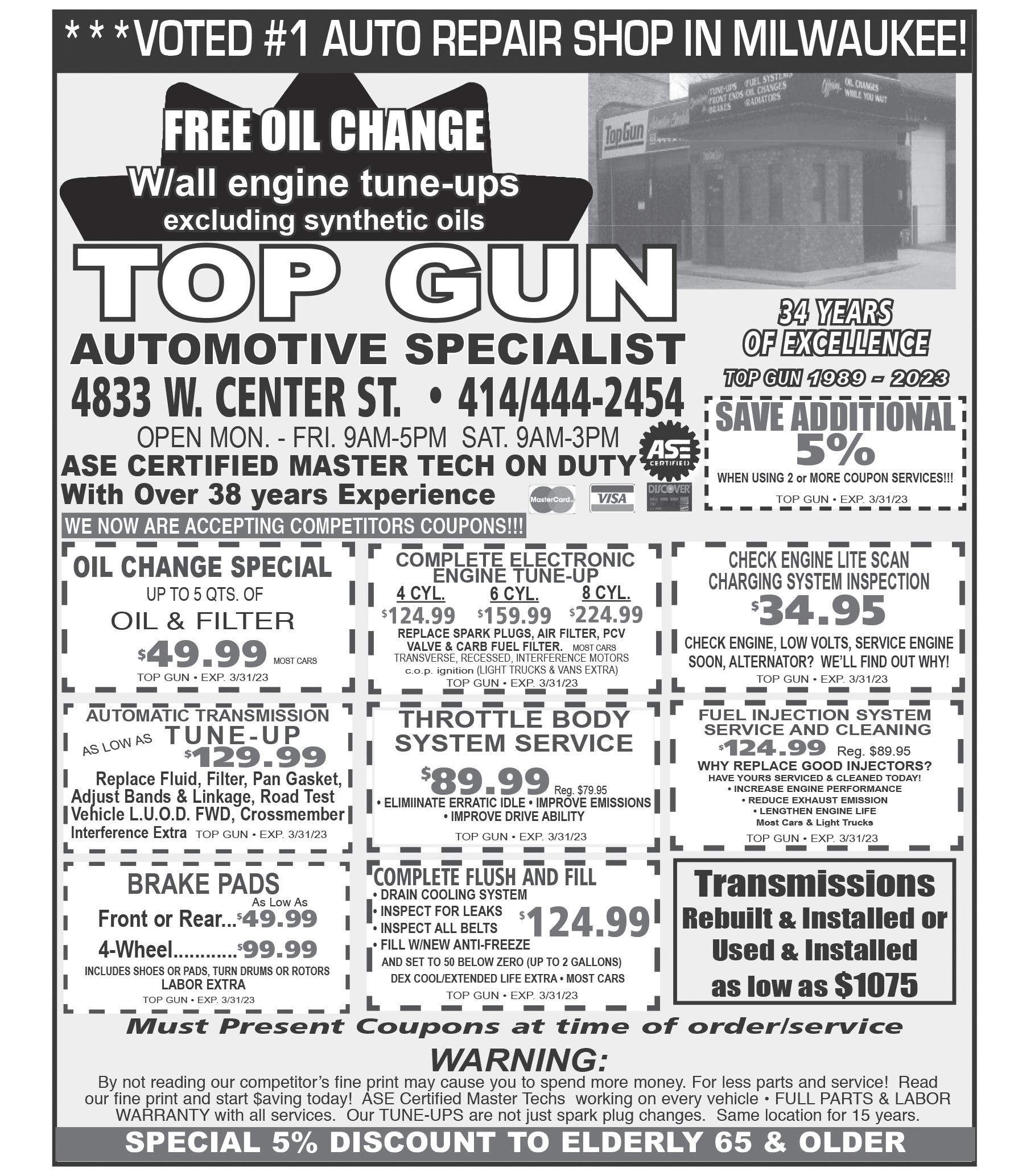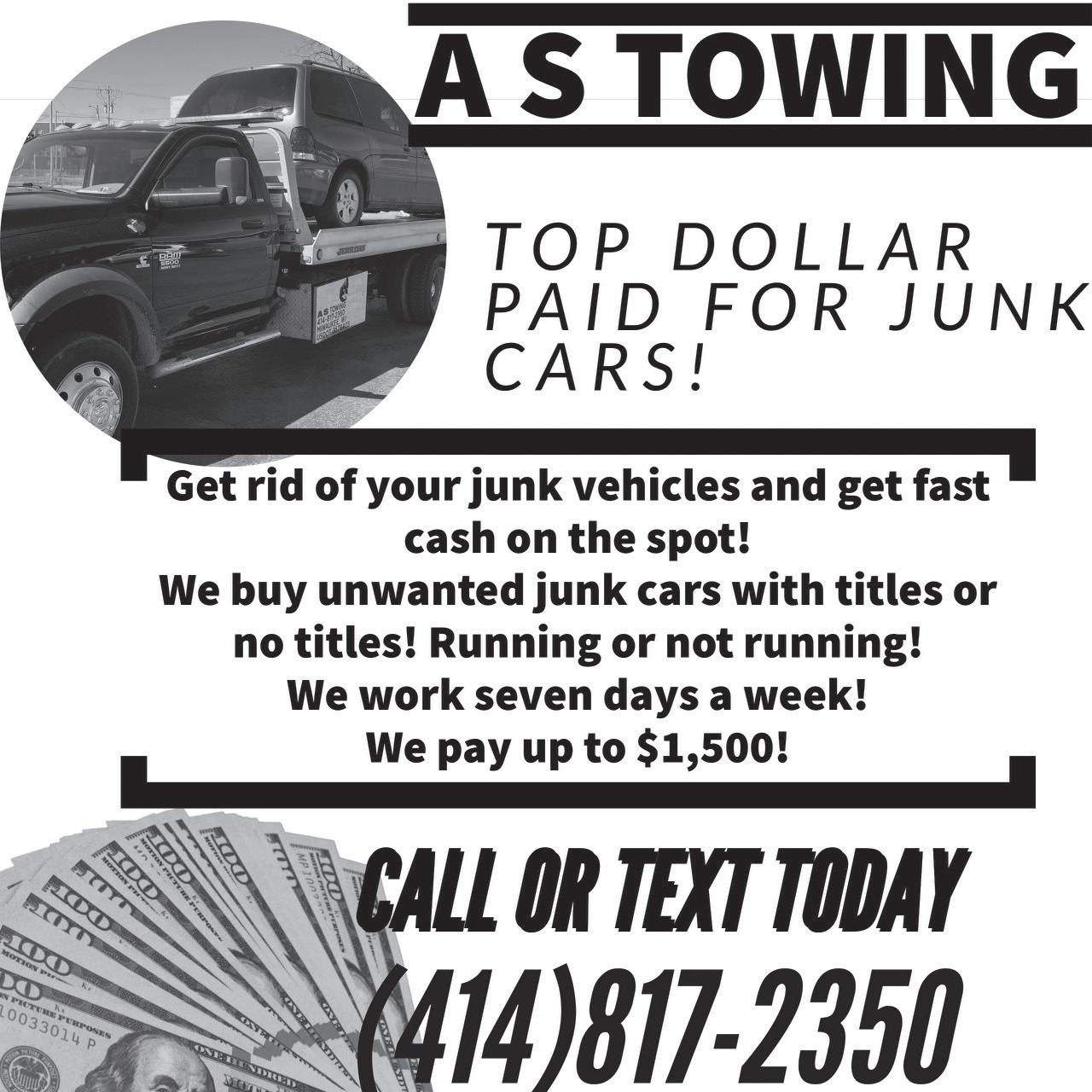 For Your Junk Vehicles •24 Hour Tow Service •Lockout service (414)628-0071 $1,000 CHANNEL GUIDE Feb. 26- March 4, 2023 2 3 2 5 2 4 2 6 2 7 2 9 2 10 2 12 2 16 2 18 2 20 2 24 2 26 2 30 2 31 2 33 2 34 2 36 2 39 2 41 2 42 2 48 2 52 2 55 2 56 2 62 2 65 TBS Superstation WTMJ Milwaukee, WI WDJT Milwaukee, WI WITI Milwaukee, WI WMLW Milwaukee, WI WGN Chicago, IL WMVS Milwaukee, WI WISN Milwaukee, WI WMVT Milwaukee, WI WVTV Milwaukee, WI BET Black Entertainment WCGV Milwaukee, WI QVC QVC Network ESPN Sports Network FSP FOX Sports TNT Turner Network USA USA Network LIFE Lifetime HIST History DISC Discovery A&E Arts & Ent. COURT Court TV MTV Music TV SCIFI Sci Fi NICK Nickelodeon HALL Hallmark DISN Disney SUNDAY CONTINUED • TOW’S • LOCKOUT’S • TIRE CHANGES • WINCH OUTS (414)759-5357 WE BUY JUNK CARS!