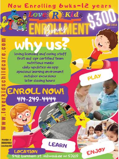 Call us today for advertising: 262-370-6429 TV WEEKLY July 30 - Aug. 5, 2023 PAGE 1 July 30 - Aug. 5, 2023 We are NOW ACCEPTING PERSONAL CARE WORKERS WITH THEIR OWN CLIENTS. Get well PAID to take care of your loved one at the comfort of their homes. Available Services • Dressing • Grooming • Feeding • Toileting • Household Services (light housekeeping) • Activities of Daily Living Please call: (414)628-2774 or (414)885-2678 We now accept clients with the following: MEDICAID, MHS & ICARE BANKRUPTCY LOMMBARDO LAW OFFICE Millwaukee’s affordable bankruptcy attorney GET RID OF BAD DEBT! Call NOW! (414) 543-3328 Milwaukee North Office: 12201 West Burleigh #3, Milwaukee WI 53222 Milwaukee South Office: 2230 South 108th Street, Milwaukee WI 53227 www.lombardolawoffice.com (414) 543-3328 We are a debt relief agency and we help people file for relief under the bankruptcy code. • STOP Repo / Lower Car Payment • STOP Lawsuits / Garnishments • STOP Utility Shutoffs • STOP Foreclosures • FREE CONSULTATION • Affordable & Easy payment options • 4.9 of 5 star Google Rating! • Evening & weekend appointments Chapter 7 filed for as low as $799! * Chapter 13 filed for as low as $0! * *Attorney fees Previous Bankruptcy? NO PROBLEM! NOW ENROLLING 6 wks. - 12 years ENROLLMENT $300 Why Us? Loving licensed and caring staff first aid, cpr certified team, nutritious meals, daily updates via app, spacious learning environment, outdoor excursions & later closing hours. ENROLL NOW! 414-249-4444 5412 Burnham St. Milwaukee Wi 53219 www.loverkidschildcare.com Provider #: 2000591062 • Location: 001 THE RED BOOK THE HEARTBEAT OF YOUR COMMUNITY A Weekly Community TV Magazine and Shopping Guide TV WEEKLY FREE