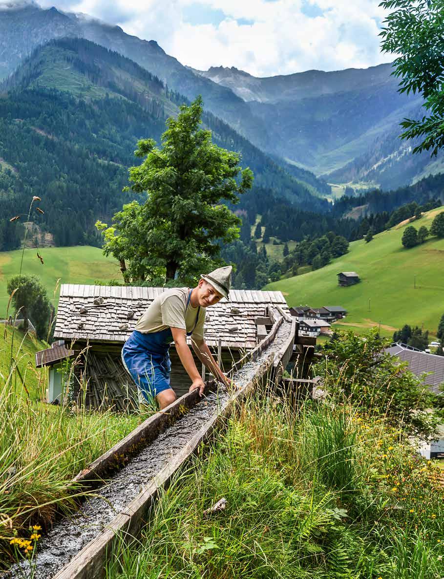 Vor der prachtvollen Kulisse der bewaldeten Luggauer Böden kühlt Mühlenwart Martin seine Hände im Wasser des Trattenbachs. Der treibt oberhalb von Maria Luggau die Wasserräder der alten Kornmühlen des Ortes an.