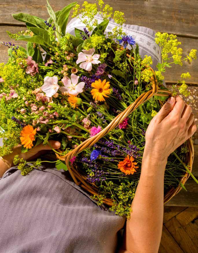 und Schere vor die Haustür. Zurückkommen wird sie mit Malven, wilden Rosen, Johanniskraut und Königskerzen. Im Garten pflückt sie Ringelblume, Rosmarin, Pfefferminze und Lavendel. Im Alpenraum werden diese Pflanzen seit Jahrhunderten rund um den 15. August – Mariä Himmelfahrt – in Kräuterbuschen gebunden und geweiht, weil ihnen nun die größte Heilkraft zugesprochen wird. Karina bereitet damit Cremen, Masken und Lotionen zu, die unsere Haut nach einem allzu sorglosen Tag an der Sonne besänftigen. Die Malve etwa ist voller hautberuhigender Gerb- und Schleimstoffe, in den Rosenblüten in Karinas Korb stecken wertvolle Fettsäuren und Vitamine, die das Gesicht pflegen, und auch die ätherischen Öle in Ringelblume, Königskerze und Johanniskraut werden in der Volksheilkunde seit vielen Jahrhunderten zur Pflege der Haut eingesetzt. Jetzt sind die Heilpflanzen vollgesogen mit der Kraft der Elemente. Sie sind eine Liebeserklärung der Sonne an unsere Haut. Am Zenit des Sommers – wo wir sie am dringendsten brauchen – stärken sie uns mit der ganzen Kraft, die in ihnen steckt.