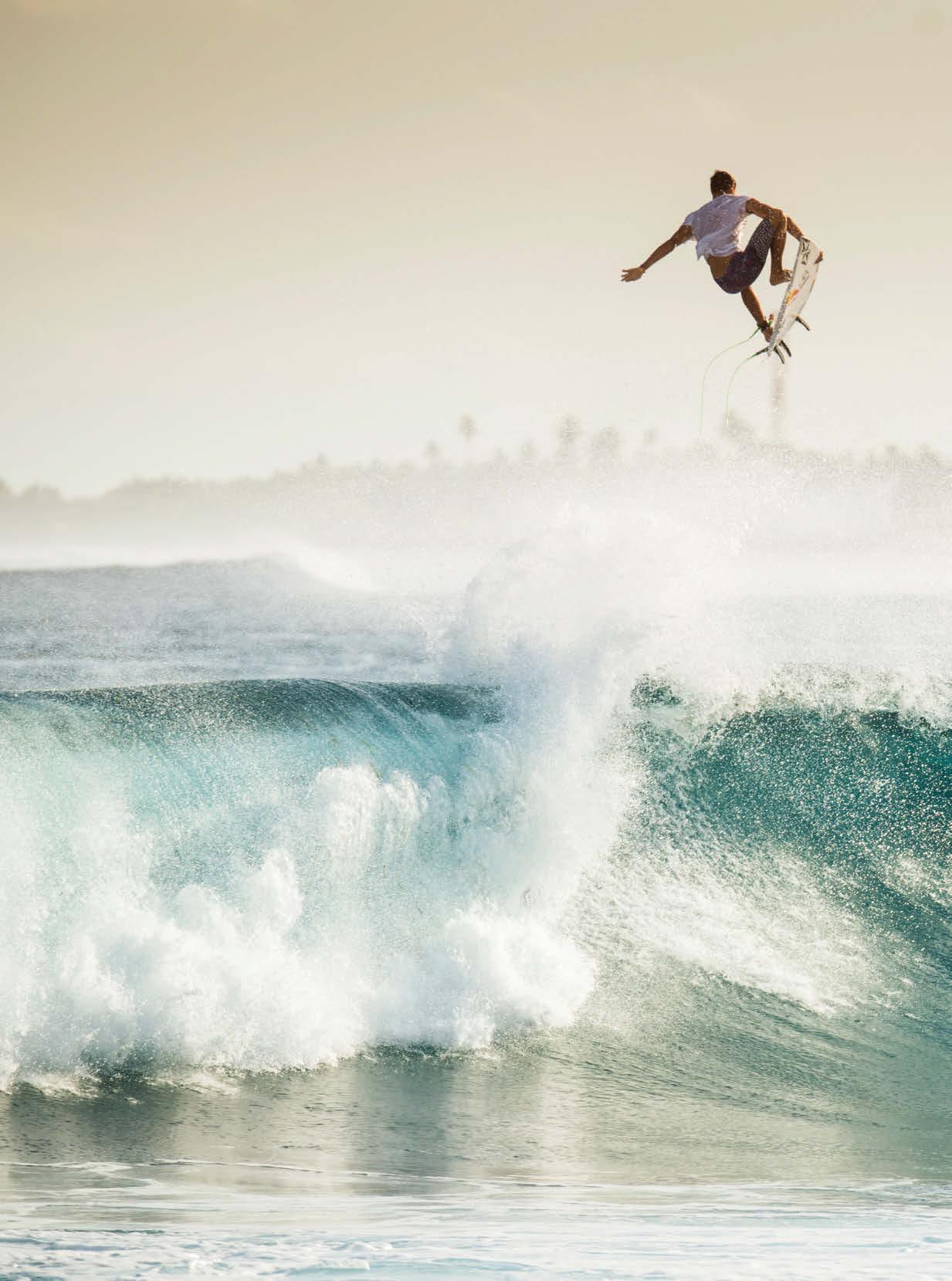 Es gibt nur einen Ort, an dem Surf-Pro Leon Glatzer noch lieber ist als in der Welle: über der Welle! Hier ist er vor Hudhuranfushi zu sehen, einer nur 800 Meter langen und 400 Meter breiten Resortinsel vor dem Nord-Malé-Atoll der Malediven. Leon, aufgewachsen in Costa Rica, ist einer der besten deutschen Wellenreiter, trat etwa bei den Olympischen Spielen in Tokio an. Hohe, innovative Airs zählen zu seinen grössten Stärken.