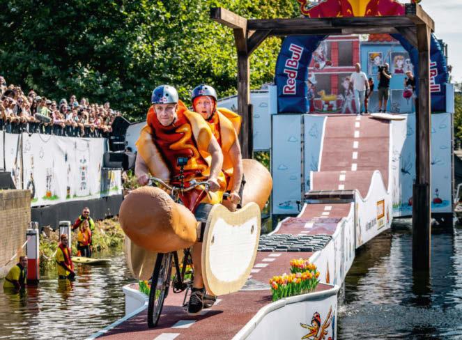 Bei Red Bull Stalen Ros sind Kreativität und Können gleichermassen gefragt. Was es braucht? Zwei Wagemutige, zwei Räder, eine Bremse und einen Lenker! Auf fantasievollen Eigenkreationen gilt es, Hindernisse wie Bodenwellen, enge Passagen oder Stufen zu überwinden –stets mit dem Ziel, auf dem Parcours über Wasser trocken zu bleiben. Hier ein Bild aus Den Haag von 2023. Dieses Jahr kommt das Spektakel erstmals in die Schweiz, und zwar am 14. September nach Lausanne. Alle Infos für furchtlose Teams und schadenfreudige Zuschauer findest du hier: