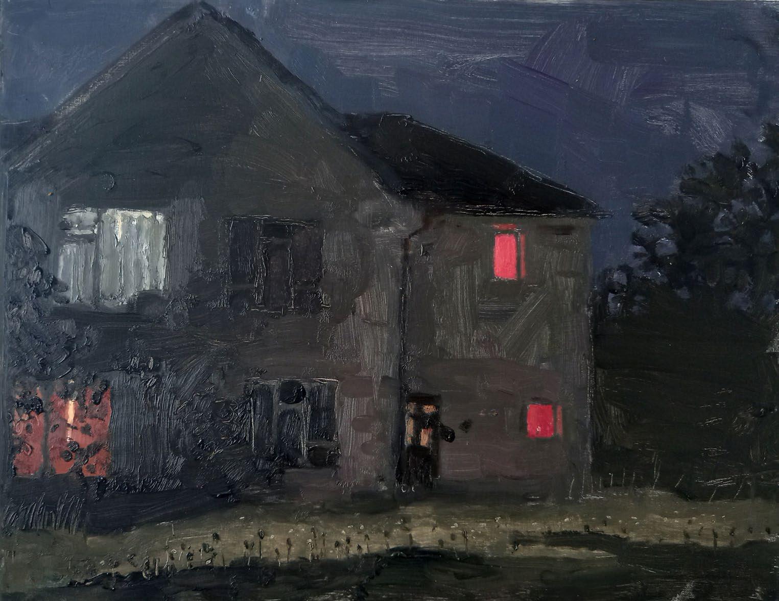 Whether the response is the extreme lyrical freedom of Annabel Gault or the calibrated control of Linda Karshan, there is a remarkable range of idiom on show here, from the loose and painterly to the precise and cerebral. We are presented with gouache feathers and orange nudes, geometry and gesture, dinner parties and red wine. Amongst all this variety, Danny Markey’s Red Room must be one of the more indirect responses. His painting only shows the outside of the house presumably containing the room, with two red-lit windows in its facade. (Traditionally, of course, red lights indicated a brothel or house of ill-repute.) One window is on the ground floor, the other on the floor above. If both light one room, it must be a double-height space and rather intriguing. But who knows what goes on in Markey’s suburbia? That has always been